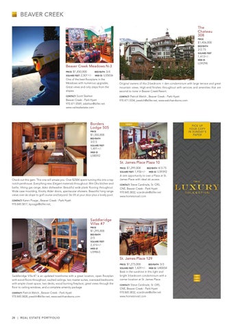 One of the best floorplans in the Meadows with numerous upgrades. Great views and only steps from the slopes. Contact: Scott Skelton Beaver Creek - Park Hyatt 970.471.0549, sskelton@slifer.net www.vailrealestate.com