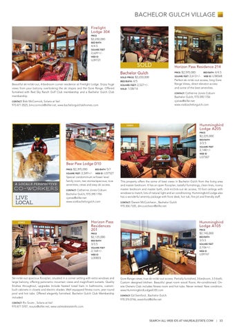 Special condominium w/lower level family room; two stories/spacious; nice amenities; views and easy ski access. Contact: Catherine Jones Coburn Bachelor Gulch, 970.390.1706 cjones@slifer.net www.visitbachelorgulch.com