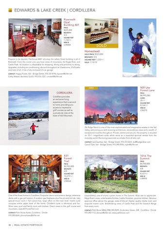 Prepare to be dazzled. Penthouse #401 sits atop the tallest, finest building in all of Riverwalk. From this corner unit, you have views of mountains, the Eagle River, and Castle Peak. Its location is unbeatable for shopping, dining and proximity to skiing. Upgrades, including air-conditioning, abound throughout its 3 bedrooms, 3 full baths and, best of all, it has a fully enclosed 2.5-car garage. Contact: Happy Power, Vail - Bridge Street, 970.331.8196, hpower@slifer.net Cathy Miskell, Bachelor Gulch, 970.376.7227, cmiskell@slifer.net