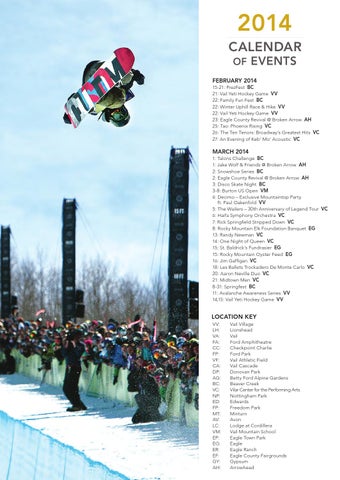 february 2014 15-21: PrezFest BC 21: Vail Yeti Hockey Game VV 22: Family Fun Fest BC 22: Winter Uphill Race & Hike VV 22: Vail Yeti Hockey Game VV 23: Eagle County Revival @ Broken Arrow AH 25: Tao: Phoenix Rising VC 26: The Ten Tenors: Broadway’s Greatest Hits VC 27: An Evening of Keb’ Mo’ Acoustic VC
