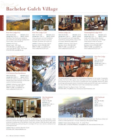 $2,349,000 BED/BATH: 3/3.5 2,291 +/WEB ID: U29643 High-end finishes, direct elevator access, air-conditioning, Gore Range views and ski-in/ski-out access. Catherine Jones Coburn Bachelor Gulch, (970) 845-2307 (888) 677-8380, cjones@slifer.net www.visitBachelorGulch.com