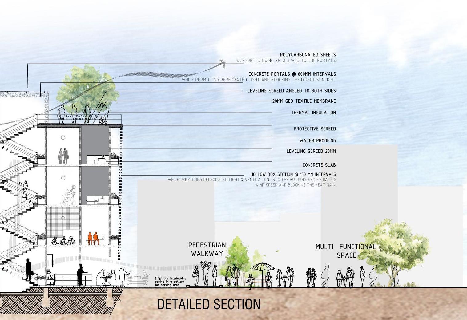 The “Meda Midula“ concept of the ancient villages is created in a vertical manner. The inhabitants are mostly dealing with the ground in the present context. Therefore creating the sense of ground was a mandatory design feature.