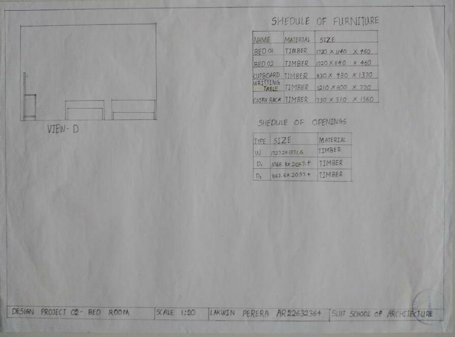 Anthropometrics and Ergonomics Bed room Re-design Project type Anthropometrics & Ergonomics Site Location no site Duration 10th May 2002 – 27th May 2022 Software Used hand drawings 2022 Portfolio Lakwin Perera 04