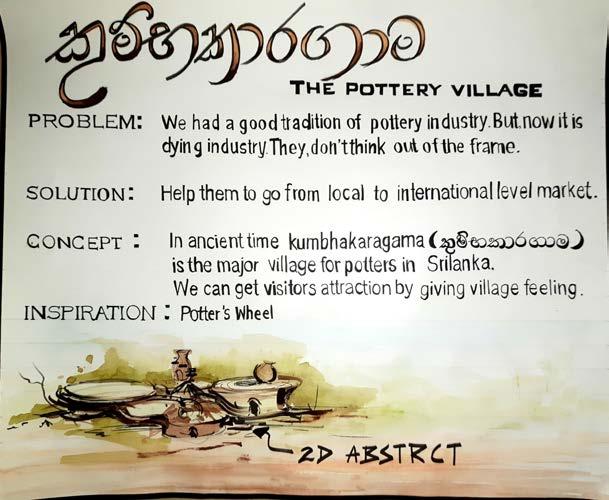 The pottery of Sri Lanka is one of the traditional small industries which has a very long history; with the evidence found in excavations from Anuradhapura and Ranchamadama, Embilipitiya the history of pottery in Sri Lanka goes back to the second century BC . Pottery has become unbroken tradition that was passed from one generation to other yet there is evidence for pottery imported from various places in the world. That proves pottery items were one of the main goods which was traded in international trading in ancient Sri Lanka The main material that is used in Sri Lankan pottery industry is clay, there are few main clay types found within the country and most of the traditional pottery villages are found near these clay deposits Nattandiya, Kegalle, Wariyapola, Dankotuwa, Kelaniya are some of them. Currently, the traditional pottery industry in Sri Lanka faces many challenges such as material scarcity and inadequate affordability. There are some new techniques added, still most of the potters make their pots in a traditional way where this sector generates a low profit. Therefore, many people who are involved in the pottery industry face many socio and economic problems. Lack of modern technology, the inefficiency of production, and the high rate of damages are some of the major problems they face Sri Lanka pottery industry is one of the small enterprises which require sufficient institutional support to identify problems and develop the industry And thereby raise the quality bar high for Sri Lanka pottery items in the world to expand further into export market The Design Project The Pottery industry is falling under Rural Industry promotion Ministry of the Sri Lankan government, is keen on establishing a new pottery promotion and production center, to uplift the traditional pottery industry and make it viable for the traditional potters by coupling the production with design and marketing teams. This Design project will be to study the activity of a Pottery center, by understanding its functional requirements, current issues and to create a new Pottery center with Design, production, promotion,