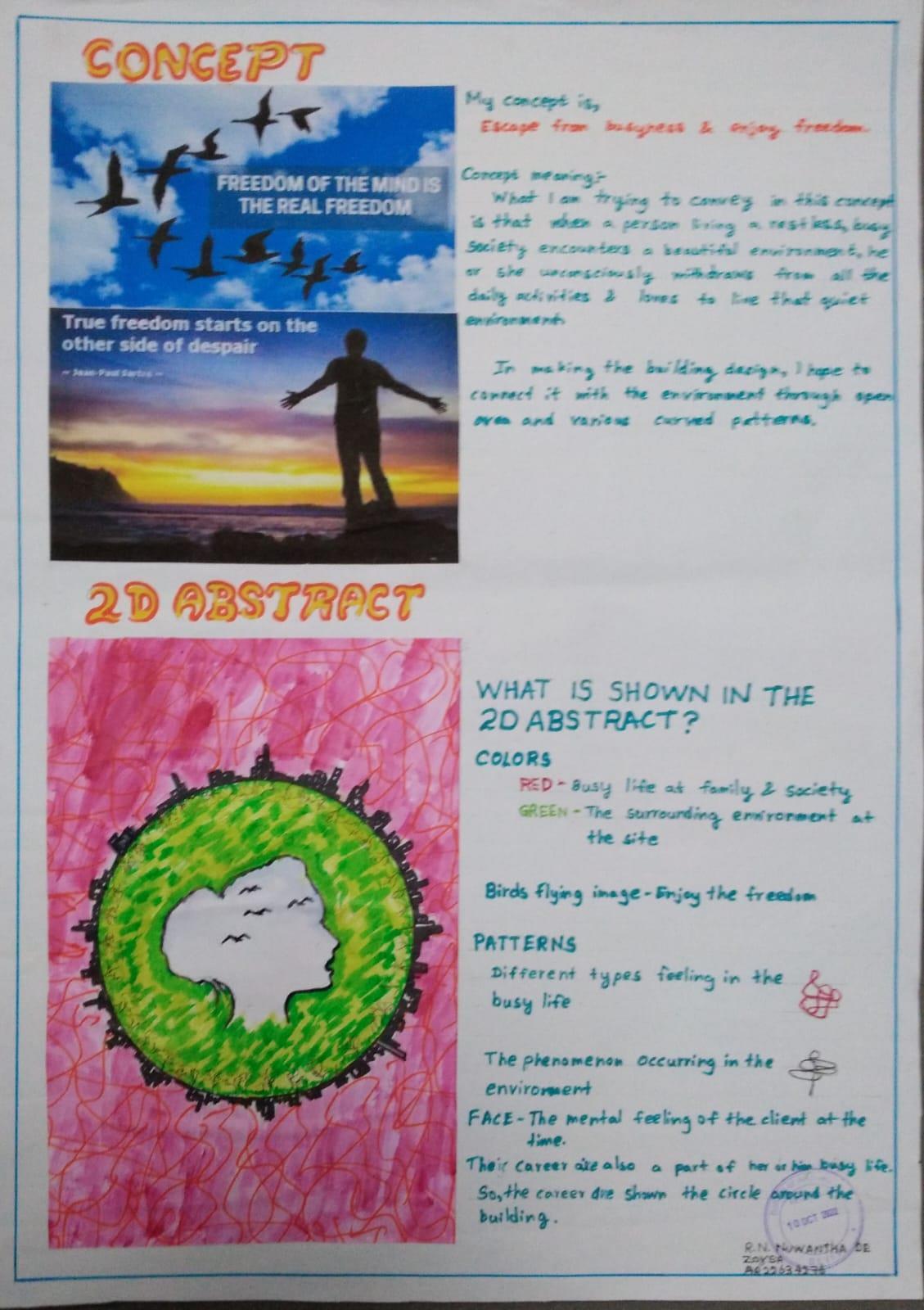 R.N.Nuwantha De Zoysa is a 1st year student from the School of Architecture at Sri Lanka Institute of Information Technology (SlIT), affiliated with Liverpool John Moores university UK. He is an enthusiastic and creativity mind who strongly believes in sustainable meaningful design concepts and principles. A designer who tries to give a realistic way to the design by following his own unique technique in his designs. In addition to it, he sees the beauty of nature with an artistic eye and works to give it to his creation in a successful way.