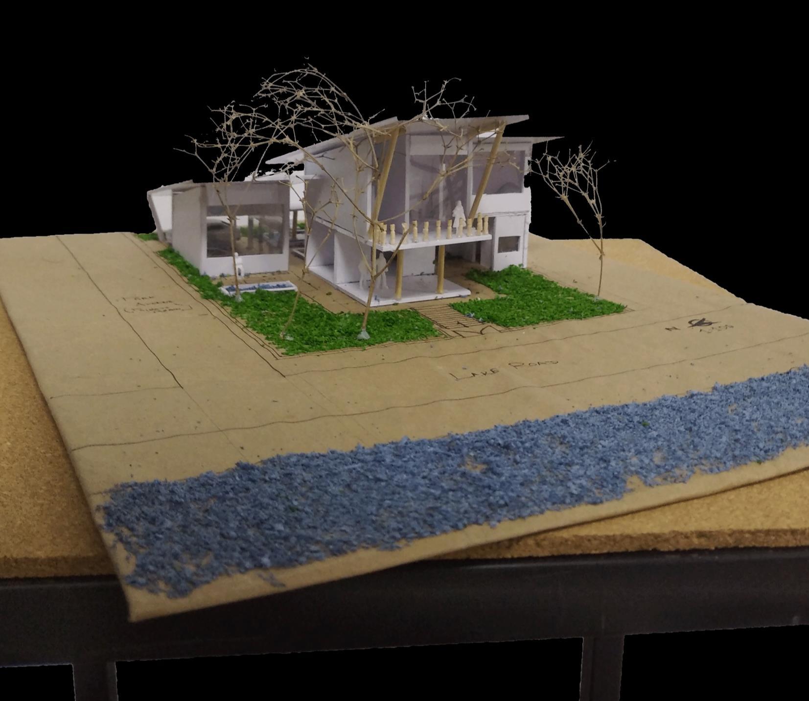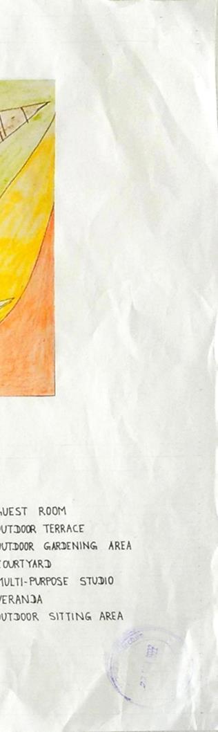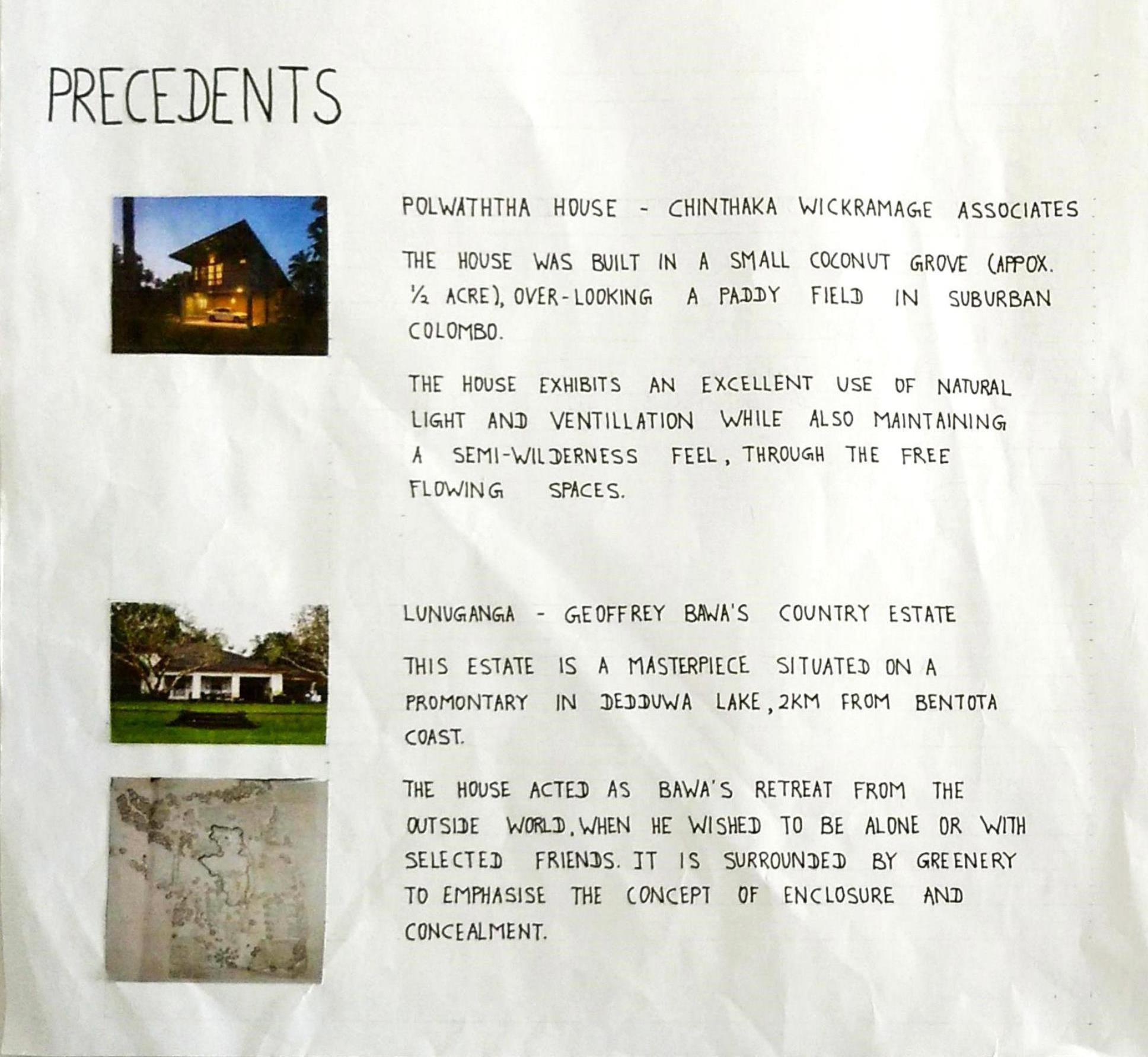 This Project is about designing a personalized house which can become a home for a selected family at a given site The client for this project was the studio tutor for the ‘Artist studio’ and the assigned site was an empty land opposite the Thalangama lake, about 2km from the main road of Malabe. The maximum size of the house should not exceed three hundred sqm and should have a maximum of three bedrooms. During the conceptual phase, interviewing the client and understanding the client’s background, attitudes, and requirements along with a visit to the assigned site in order to understand the site conditions was required to be done Upon analysis, the client for this project was found to be an individual who experiences life to the fullest and who treats every small activity as a celebration, and although they lead a colorful life, they do not exhibit it to the world. This inspired the concept for this project, “concealed celebration.” The house design was created to be a solution and a safe haven for the client to experience and enjoy life, while providing the privacy they desired. The form for the building was greatly inspired by the cross-section shape of a coconut, as the exterior of the coconut may seem rather simple, while the true taste and celebration lies within Inspired by Geoffrey Bawa’s Lunuganga house, the design features a strong tree line which shields the house from the two roads that provide access to the site Lunuganga functioned as Bawa’s retreat from the outside world whenever he wished to be alone or with selected friends, and this idea is incorporated into the house design. The main access is given on Lake road and the service access is given towards the back of the site. As the site is located in a slight slope, the entrance steps are cut into the earth to create a progressive reveal of the buddha statue placed in the very back of the land, which is highlighted upon entry by the box arches and sliding glass doors At the top of the stairs is a lobby which is open to the front garden and the lake view, which serves as a meet and greet area A flower pond paired with the natural breeze of the sight provides a cool, relaxed environment. Glass sliding doors lead into the living room consisting of a simple concrete couch that is cushioned, and a small coffee table. The northern wall which is made entirely of glass opens into the terracotta laid outdoor terrace and plunge pool. The central courtyard can be accesses from the living room through the veranda. This further branches out into the kitchen and dining room on the left and the guest bedroom, powder room and laundry room on the right At the most secluded part of the site is the meditation pavilion and the buddha statue Through the monsoon winds, the sweet scent of the cannonball trees at the back of the site carries onto the pavilion which creates a calm and pleasant atmosphere. The second level consists of the master bedroom, paired with a walk-in closet and a shower which can be accessed through the private balcony as well. A view of the Thalangama lake as well as the buddha statue can be seen from the bed. The second level also consists of multi-functional workspace as well Prominent slanted roofs shield the building from the monsoon rains while also creating an interesting façade The design maximizes the view of the Thalangama lake on the western side of the land, while also being a functional safe haven for the user.