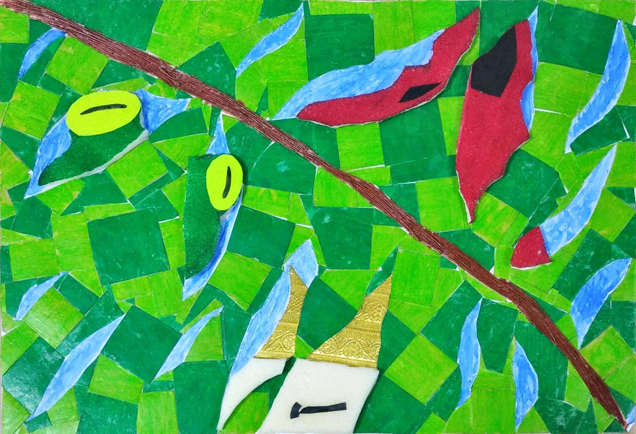The design project is about analyzing and understanding a character, arriving at a concept, and representing it through design. The assigned character is Andare, a court jester of medieval Sri Lanka. As history suggests, Andare was a clever court jester who lived during the 18th century during the reigns of Kings Kirthi Sri Rajasinghe and Rajadhi Rajasignhe of the Kandyan kingdom He is believed to have been born in Udamala, in southern Sri Lanka It is said that Andare’s humorous acts and sarcastic comments entertained both royals and commoners alike. Despite being a mere comedian, the tales of Andare suggest the superior intellect he had which aided in him turning situations to his favor. He was also a skilled archer, a prolific poet and a cunning character who adapted to situations accordingly. The design for this project is centered around the story of how Andare shot the frog, in which Andare highlights many of his skills and characteristics The design is made as a collage in the shape of a large leaf to allude to the complexity of the character and that he is a combination of multiple characteristics. The notable characters seen in the story, namely the frog, Andare himself and the King are seen hidden amongst the leaf to imply that even though at face value he is a court jester, he has many hidden abilities and that he is a far more mysterious character Here, Andare is represented as a fox to represent his wit and cunningness Various materials are used in the wall plaque to represent emotions and characteristics. A shiny wax coated sheet is used for the leaf collage to show how he is somewhat of a slippery character, with the ability to escape tough situations with ease. Sponge is used to show how Andare was able to soak up information quickly from his surroundings, complimenting his exceptional analytical skills. Lace is used to show royalty, as he was a court jester in the Kandyan era Metal wire is used to build the midrib of the leaf, to represent his strong unwavering belief in himself and how he is true to himself Colours such as red, gold, green, blue, and yellow are used to represent characteristics of Andare such as cunningness, royalty, refreshing, cool/calmness and happiness respectively.