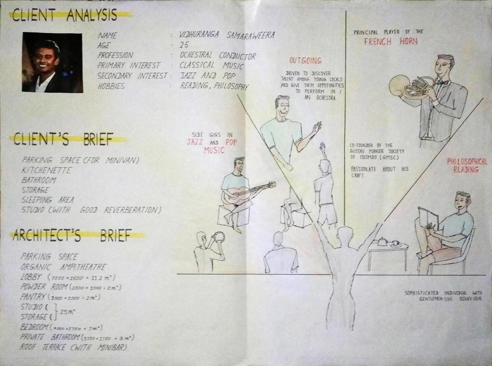 The design project is about designing a small free-standing building which is a studio and bedsitter for a creative artist at a selected site The studio should mainly respond to both the character of the artist and the art form. We are asked to select an artist of our choosing, interview them, analyze their personalities and art forms, and design a studio to compliment and provide the best possible space and atmosphere for them to create their art form. A suitable site must be selected, not less than 10m by 15m area to be able to fit a 50sqm studio building. The design should consist of a studio space which reflects the artist’s style of art, basic accommodation including a sleeping/resting space, a small pantry and a bathroom to provide necessary facilities for the artist when staying over and working for several days at a stretch The client selected is an orchestral conductor in the field of classical music, who also has an interest in philosophical reading. The selected site is at an empty plot of land on Perahara Mawatha, opposite the Gangarama lake. As the client is a profound individual who is a specialist in classical music, the building design follows the concept ‘Grand Crescendo.’ In classical music a crescendo is the gradual increase in loudness, leading to a climactic ending This design will send the artist or any visitors through a progressive journey of grandness, which mirrors the growth of an orchestral symphony, while catering to different views as you move up the levels. The lowest level is made open on all sides and is completely white, consisting of a central spiral staircase illuminated by warm light flanked on either side by the pantry and powder room. A few minimalistic furniture is placed here to function as a lobby area. An outdoor amphitheater is present for guests to watch the artist perform, utilizing the building to function as a dramatic backdrop. As you progress upwards into the next level you come into the main studio space which has a double height room A large curved double-glazed window makes the northern side of the building, which gives a unique architectural characteristic. This space draws inspiration from the chamber room of the parliament building of Sri Lanka designed by Geoffrey Bawa. Reflective panels are fixed in the ceiling with light fixtures facing upwards, which creates a dramatic and interesting environment. The central chandelier functions as a skylight as well, assisted with artificial light fixtures to help illuminate the space. In contrast, at night-time the space is illuminated with a faint blue lighting which mimics the moonlight which falls in the Gangarama lake, opposite the building The walls are fitted with textured wood panels which help with reverberations As you progress upwards you reach the mezzanine floor which consists of the sleeping area along with a private bathroom. Here the client has a private space for reading along with an excellent view of the lake. Going up the stairs once more leads to the roof terrace which represents the peak of the crescendo. A mini bar and lounge area is located here for the artist to entertain guests and perform under the moonlight if they wish The plan of the building is inspired by the shape of an orchestral arrangement This design will inspire the client’s students and visitors and create an interest in classical music within them, as they progress through this journey.