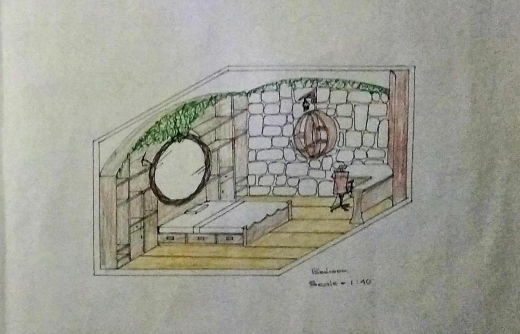 The design project is about redesigning the interior of our personal bedroom according to our own anthropometric data. The design process included understanding the requirements of the client, arriving at a concept, and creating a functional living space which meets with the user’s personal requirements, based on their anthropometric measurements The design for this project follows the concept, ‘teleporting to a fantasy world’ and is greatly inspired by elements from the Lord of the Ring’s universe created by English writer and philologist J. R. R. Tolkien. His creation served as my personal getaway from reality and was principal in my upbringing. The re-designed bedroom serves as an escape from reality, which is achieved by teleporting the user into a fantasy world experience. This experience was created by emulating the feeling of being in a hobbit’s hole, by bringing down the ceiling and creating a dome like structure The walls which were formerly brick were re-designed by the addition of veneer limestones, which gave the room an interesting depth, while also adding to the brightness of the room. A steel frame runs from the floor to the ceiling formulating the dome and vines are grown through these, creating a mystical environment. Light fixtures are placed among the vines in order to generate an interesting ambiance that compliments the concept A pivoted bay window is added as a solution to the inadequate amount of light in the existing bedroom A bed along with a bed frame which features storage compartments, and a large mirror is designed as a solution for the lack of storage space in the existing bedroom. An AC duct is placed at the center of the room to provide sufficient ventilation and cooling. The furniture of the re-designed space is directly inspired by the Lord of the Rings movies and provides an aesthetical input to creating the fantasy world. The overall concept is achieved through manipulating light, use of materials and furniture and the cozy, cave-like feeling created by the low ceiling height