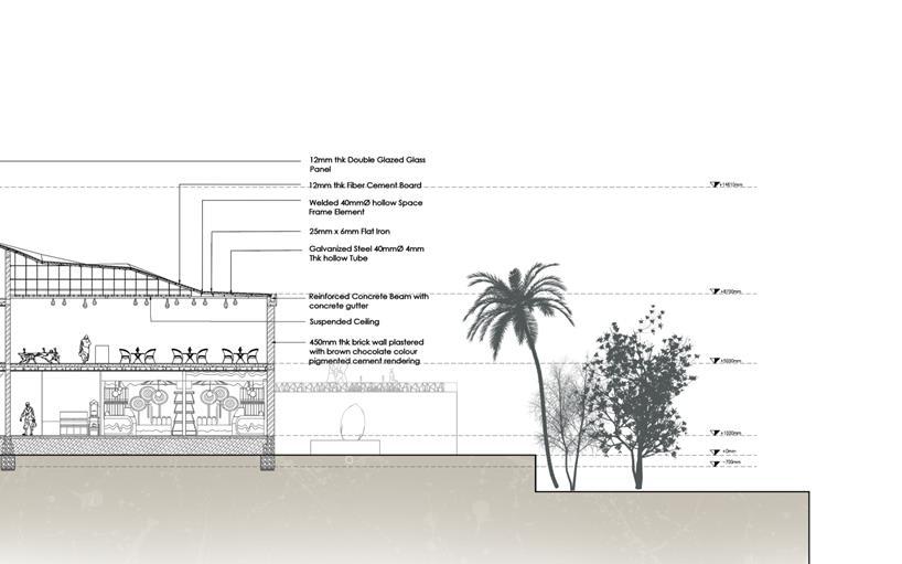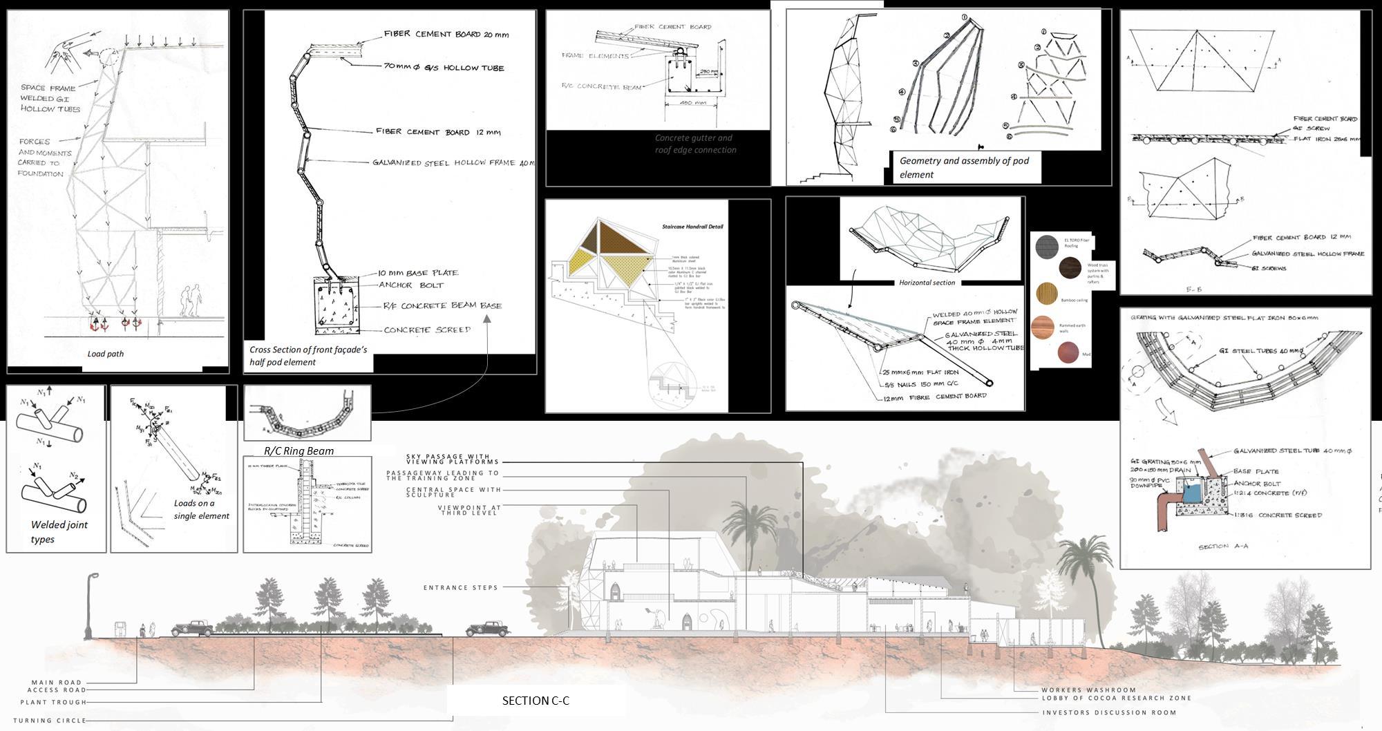 Since the laymen is more aware of the chocolate than cocoa, it starts from the modernized sculptural building form and then if the visitors want to taste chocolate and learn about history they will stay in the public and commercial area. At the ground floor, cocoa tasting pods and a museum are located. In the upper floors they can experience cocoa making by reading at the library, tasting at café, and buying at outlets Top floor is having access to a sky passage where they can get a panoramic view of the beautiful Victoria reservoir and the mountain range. The sky passage will direct them to the model cocoa agro forest which will have an extent of about 2 hectares. If the visitors wish to experience the raw cocoa production process, they will be directed to that area from the ground floor itself The form transition is drastic from monumental to more eco friendly single floor cocoa processing area. The structural materials, finishing materials etc. are all sustainable local materials in this region. There is a courtyard which will be an interaction zone between the visitors and the workers. Along the way the visitors can experience and observe the cocoa butter producing process The south end of the center is the training and education zone