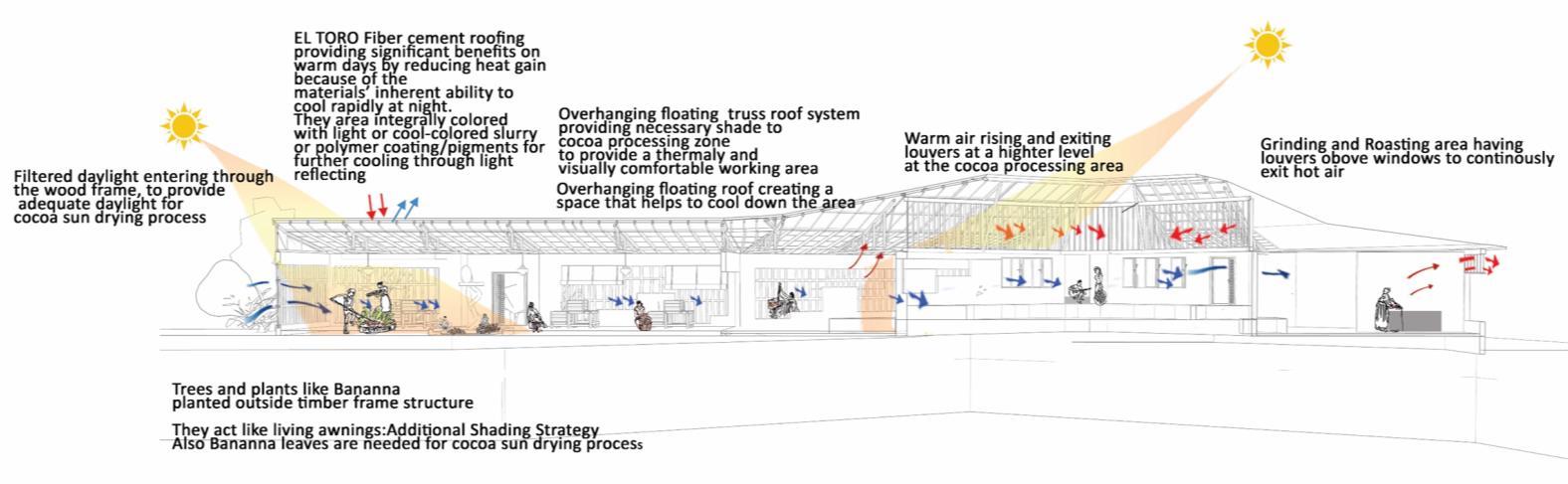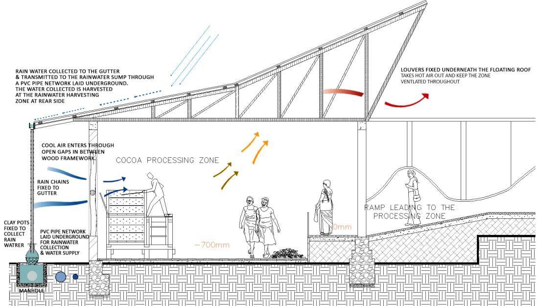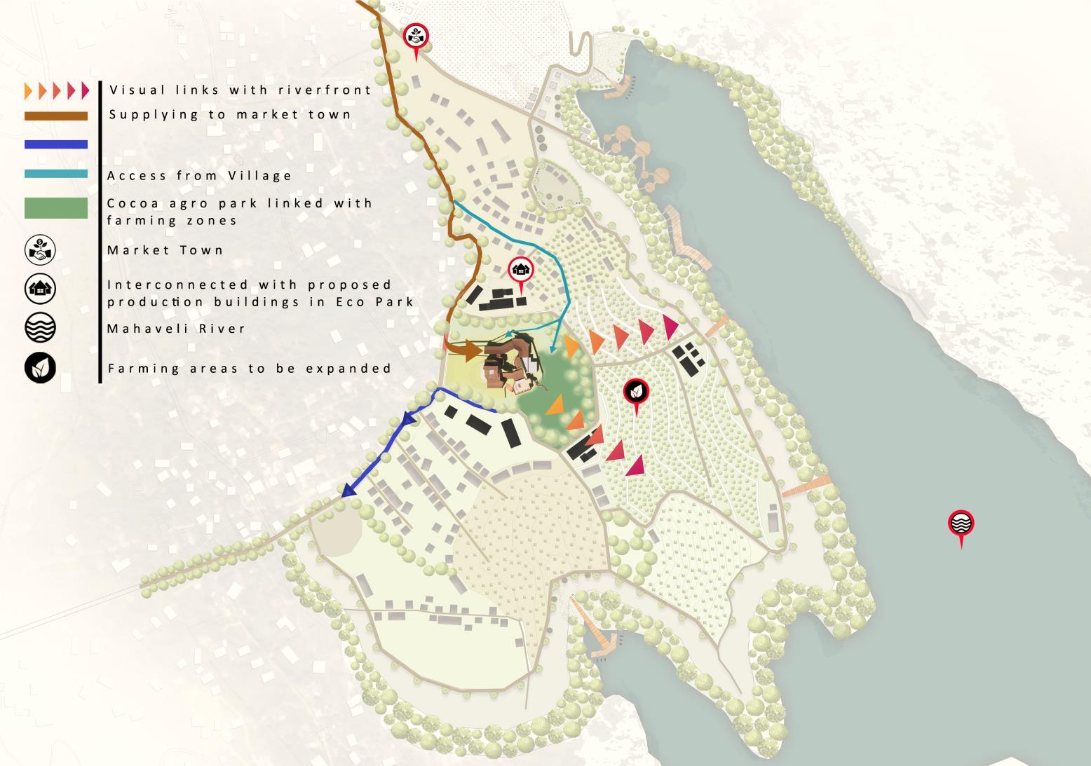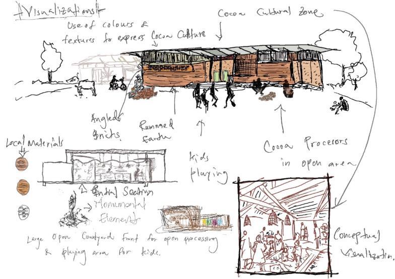 This development is primarily focusing on the people dwelling within Digana township, and the outsider visitors and tourists come secondly This center is utilizing and uplifting the existing livelihoods and potentials of people living in Digana It is a place for people, created by the people. This center will serve as the central facility that is dedicated to rural revitalization, and the fundamental architectural initiative is dedicated to uplifting the way of living of people of Digana engaged in agro based livelihoods like cocoa production. This design includes a series of programed activities from processing cocoa, learning about cocoa production, researching about cocoa, experiencing the production process, marketing and interacting These spaces will be connecting with each other would encourage workers to engage more actively on work while marketing the potential with this series of loops of activities.