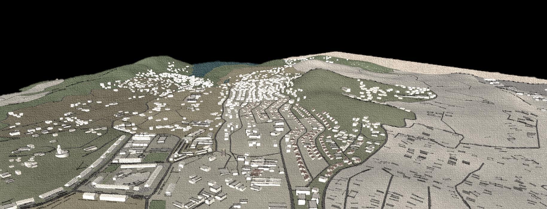 • Building heights vary from single story to four stories. The horizontal widths of the buildings are proportionately smaller than the heights