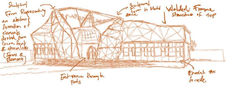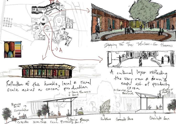 Similarly the idea that is expressed in the design is to reflect the process which starts from a very raw scale down to earth procedure with cocoa seed and ends up with a luxurious chocolate produced (‘bean to bar’ process). The design itself will depict this functional transition using forms and spatial qualities. The contradictory nature of raw cocoa and finished chocolate will be expressed through different forms and spatial languages, which mimic the tasteful nature of the whole process The concept “Tasteful Contradiction” forms from this idea and reflects through the design process as well as detailed resolution