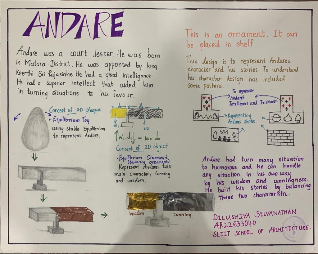 This Project is about analyzing and understanding a character, arriving at a concept and representing it through design. Initial design exercises were done through researching the background and history of andare and came up with a idea of concept to develop 2D and 3D. Concept is build with equilibrium to represent andares character. And 2D design is inspired by equilibrium toy and 3D design is inspired by see-saw.