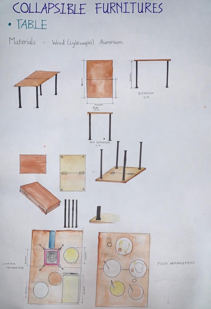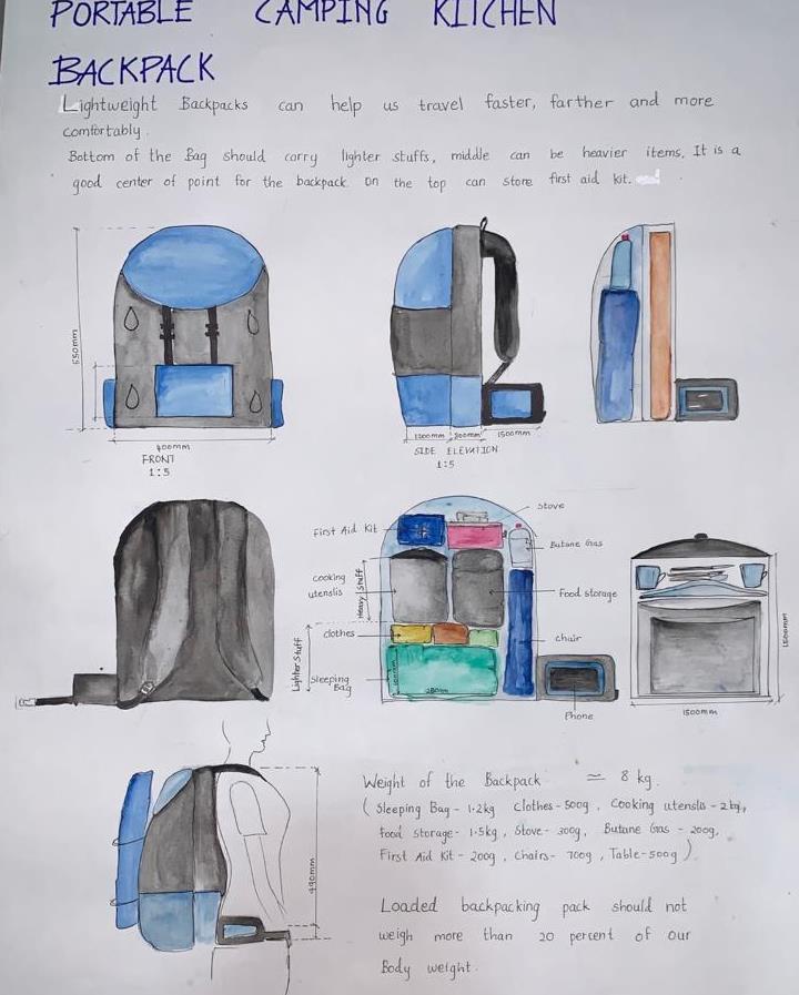 This project is about portable camping kitchen which will be enable to prepare meal for two person who are camping partners. The portable camping kitchen is design according to the anthropometrics. And also consider the weight. The portable kitchen contain the shelter , collapsible funitures and utensils.