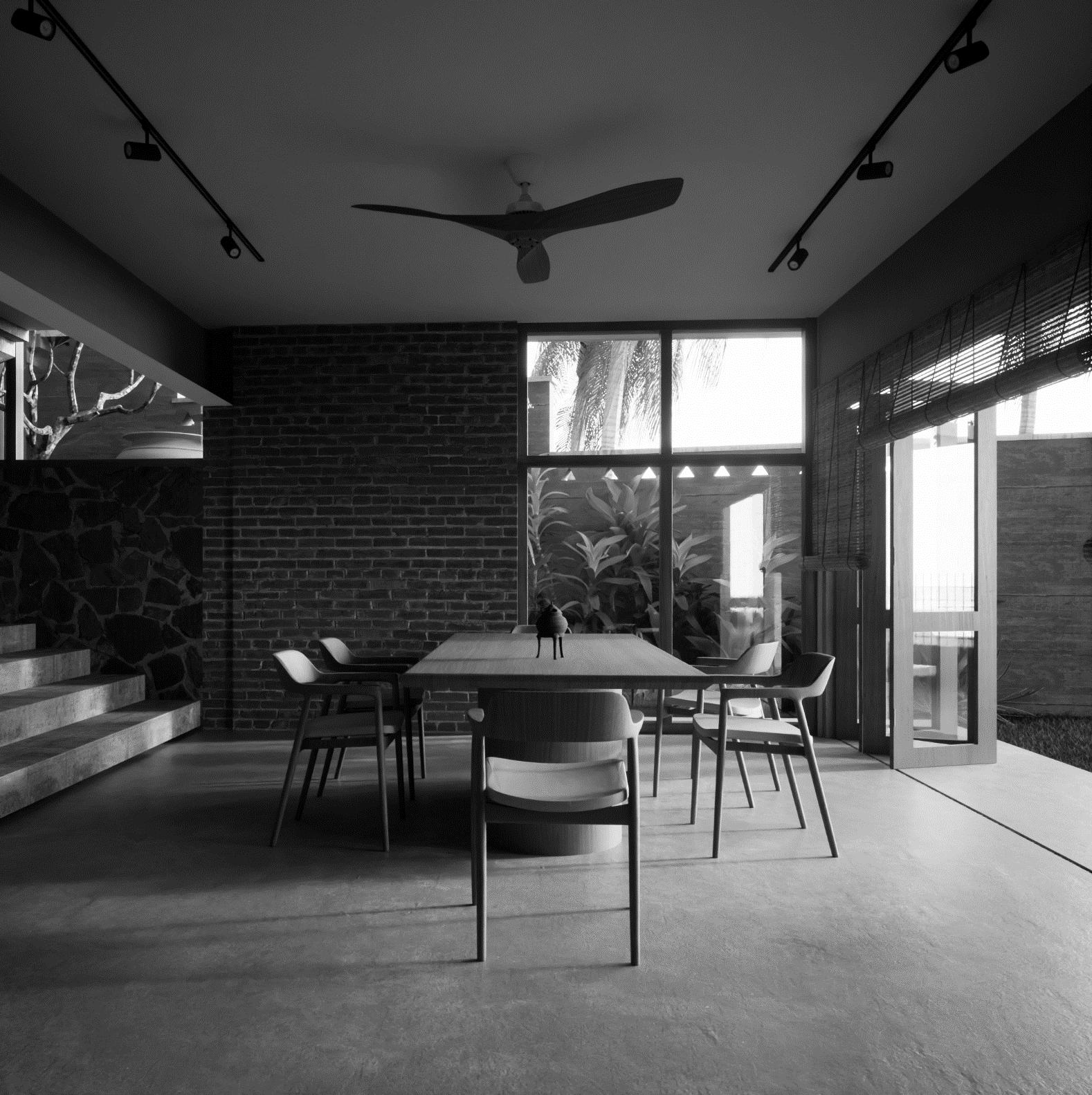 When someone enters the studio from the main gate, they will go through the main door to the living and dining area. The sofa in the living space can converted into a small bed where my client can rest or sleep From that space there are few steps that goes downwards to the workstation area which has a beautiful view of the greenery and the small water body at the end of the land.