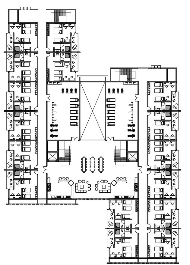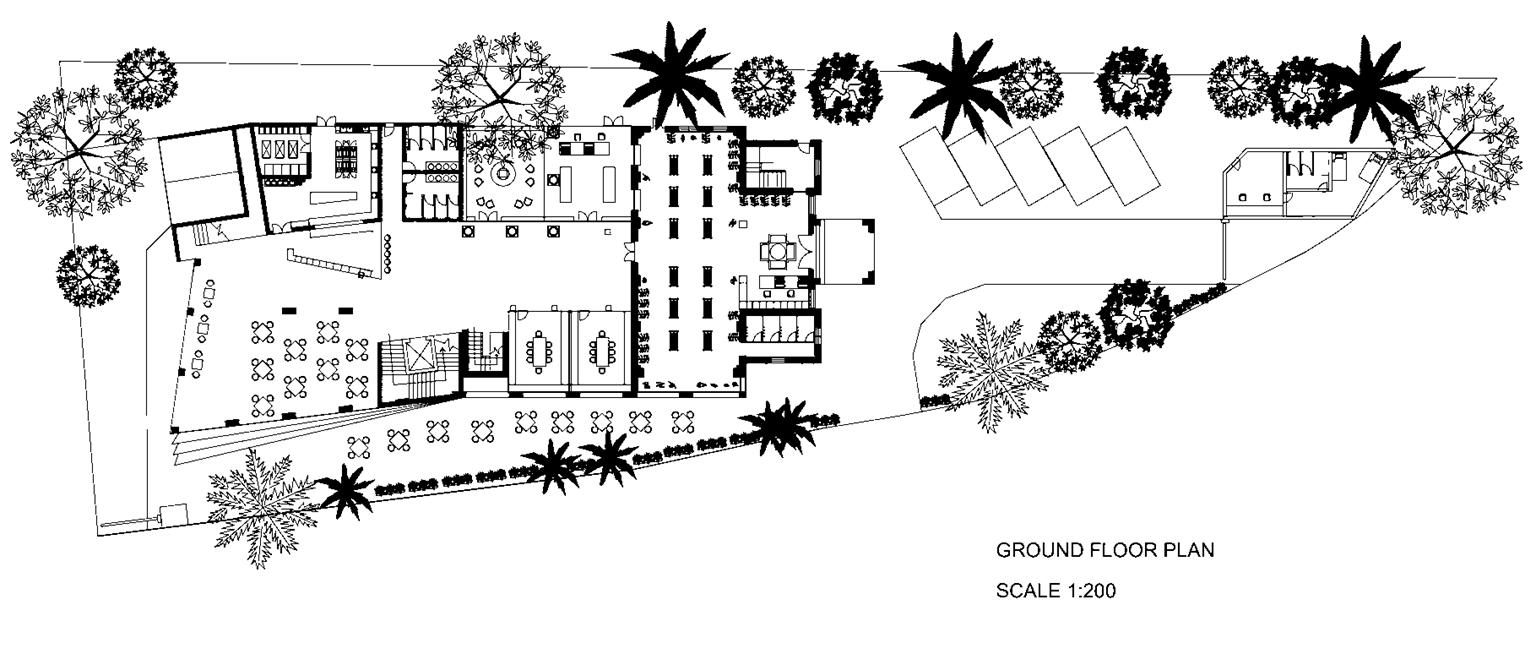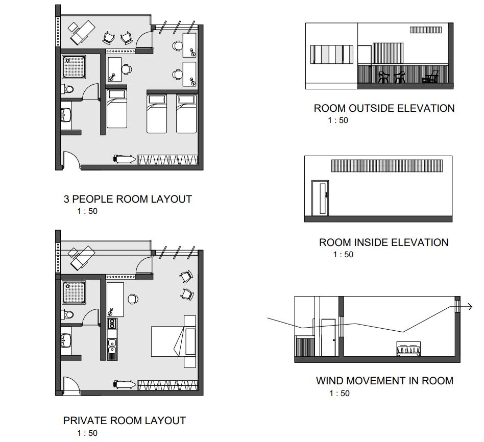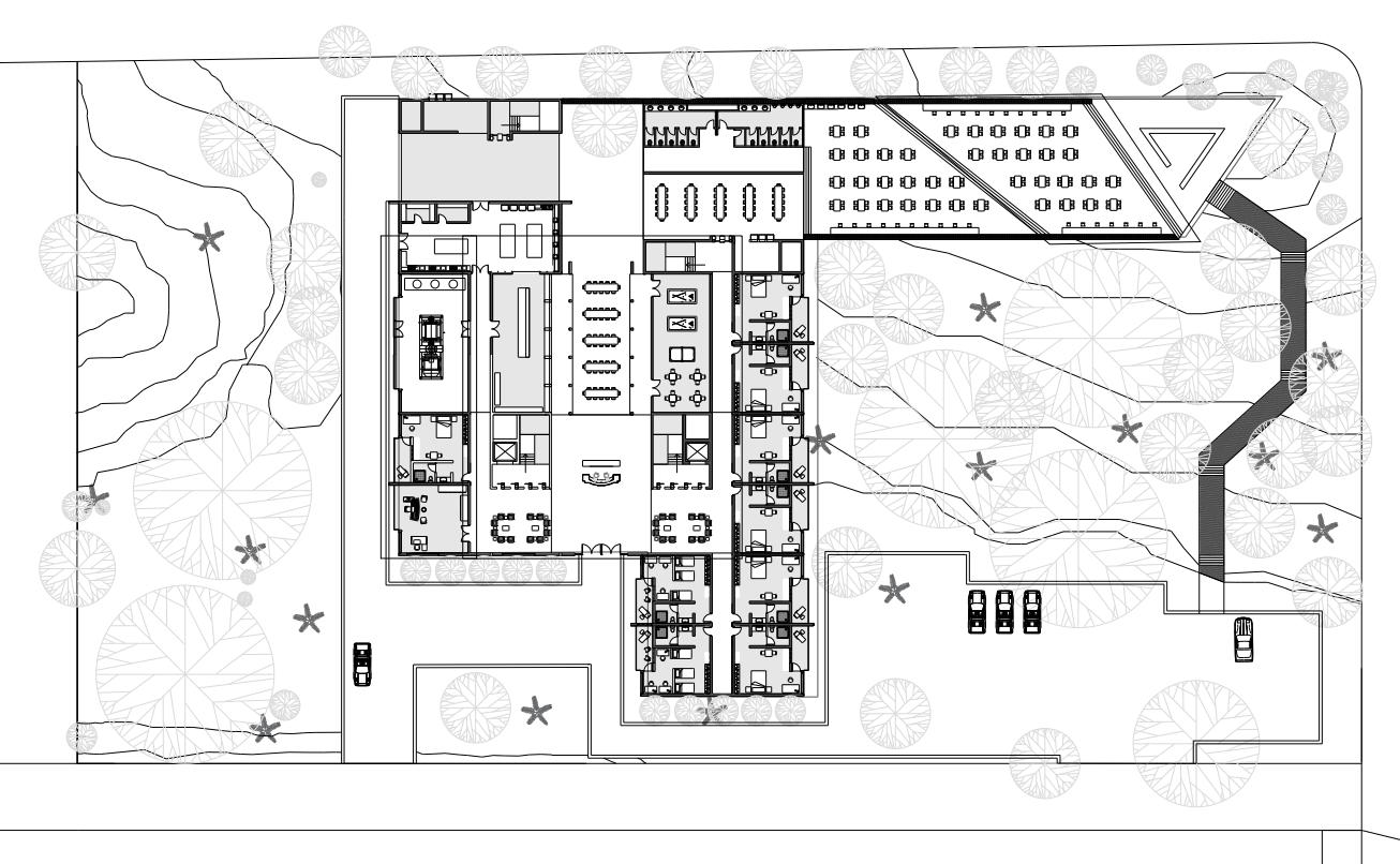 Even thought the Boys and Girls hostels are separated, the have a common connecting space for each floor of the building to promote the socialization. Hostel is fill with outdoor-indoor games , activates for the students. The core space in the design is common hall , which is designed to studying. This hall is open to outside to bring the student more close to nature This hall is also made in a step way to respond to the site contours