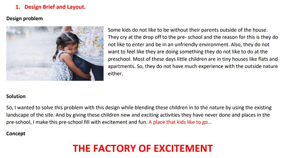 This Design project objective was to study the activity of a Pre-school and a Day care center , by understanding the user(s), its functional requirements, and to creating a new Day care center with a Pre- school for 60 Children of different age groups starting from age 1+ years The problem I identify from this age group was that lot of these little children were refusing to go outside from their houses Main problem for this is , that children are not interact with the environment and natural surrounding enough It will make them always seek safe and warm place through their entire life. So, for make these children blend in to the nature, I propose varies spaces and activities to interact more and more at the site, so they can learn to take risks and be stronger one day through facing the nature and its true Nature