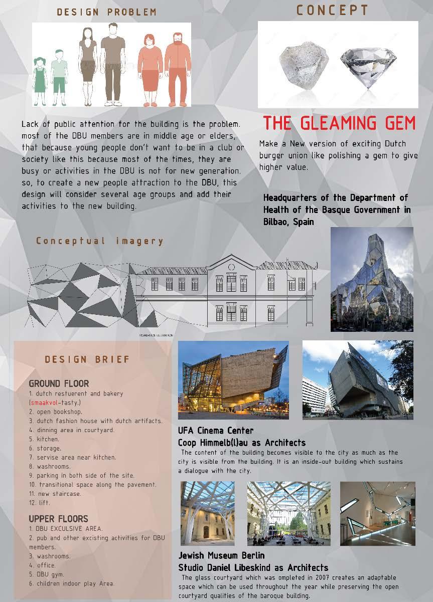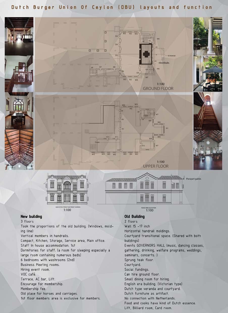 This project site is located in Thunmulla junction Colombo 04. Dutch burger Union started in 1908 by Richard Anthonisz. The intention was to promote the moral of Dutch intellectuals, Dutch descendants, and social wellbeing of the Dutch burger community. DBU is still function as an iconic Dutch Burger Heritage in Colombo as well as sri lanka In this project as designer, i had to come up with a design solution to re catch the peoples attraction this building had in all days by re-design a Functional brief to the old building while designing a extension new building attached to old building. To re gain the attraction of the people to this building and to the DBU, I focus deferent age categories and their favorite activities in this Thunmulla area. From that approach I have designed a 3 story new building containing with a DBU GYM FLOOR , CHILDREN INDOOR PLAY AREA Exclusively for DBU members to promote the new memberships from Young and Adults In the 1st floor I design a DUCTH CAFÉ and DUCTH FASHION CORNER which is open to general public to promote the Dutch culture and for the the building form in a CONTRAST and I use