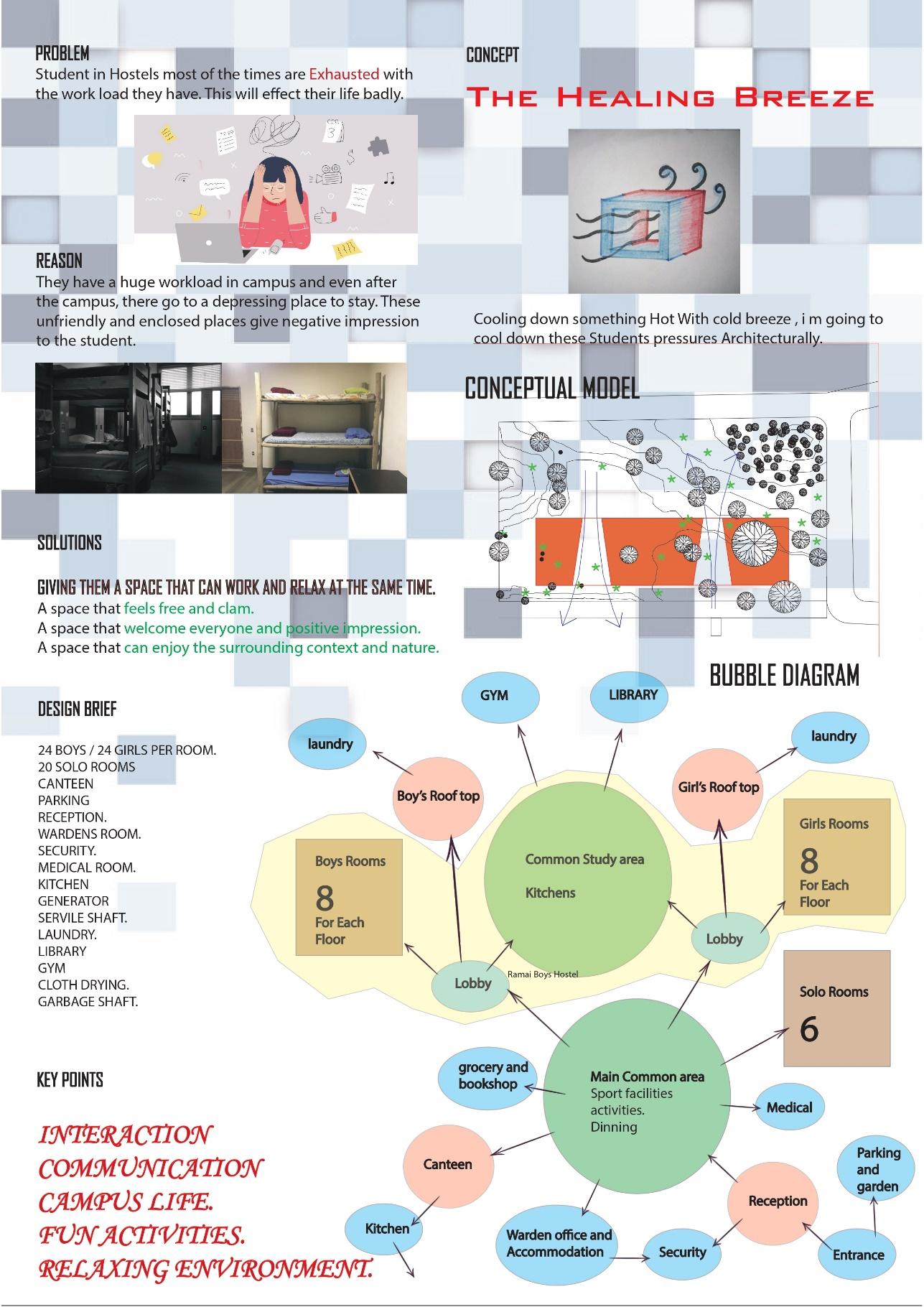 The problem I identified was , Uni students highly stressed with their uni work and boring life style. So I wanted to create a space that will heal this students. For that I use psychological methods like gathering with others , socialization , freedom , wisdom and I use the beautiful environment of the site to achieve these objectives