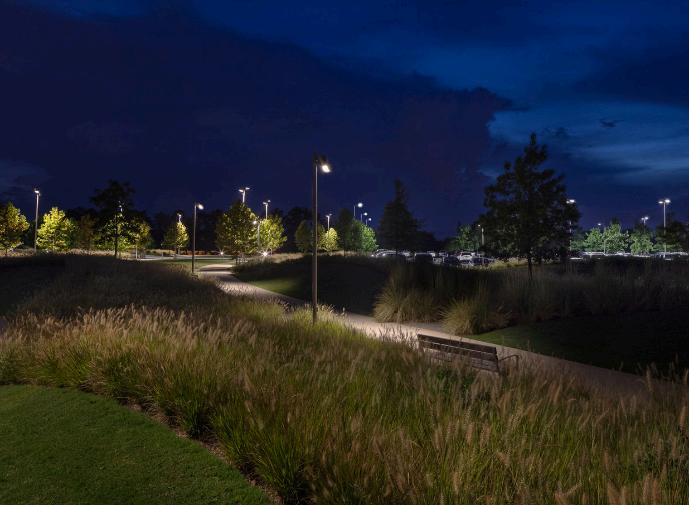 At the Ann and Jim Goodnight Museum Park, part of the North Carolina Museum of Art, Civitas landscape firm applied the principle that even, low-intensity lighting improves visibility. Lighting designer Linnaea Tillett interpreted this concept by placing shielded fixtures at regular intervals along pathways to minimise glare. In the 'wave garden', focusable luminaires softly illuminate benches and lawns, creating warm, inviting spaces for gatherings. This subtle lighting strategy enhances the park’s 65 hectares without overwhelming its natural beauty or creating stark contrasts.