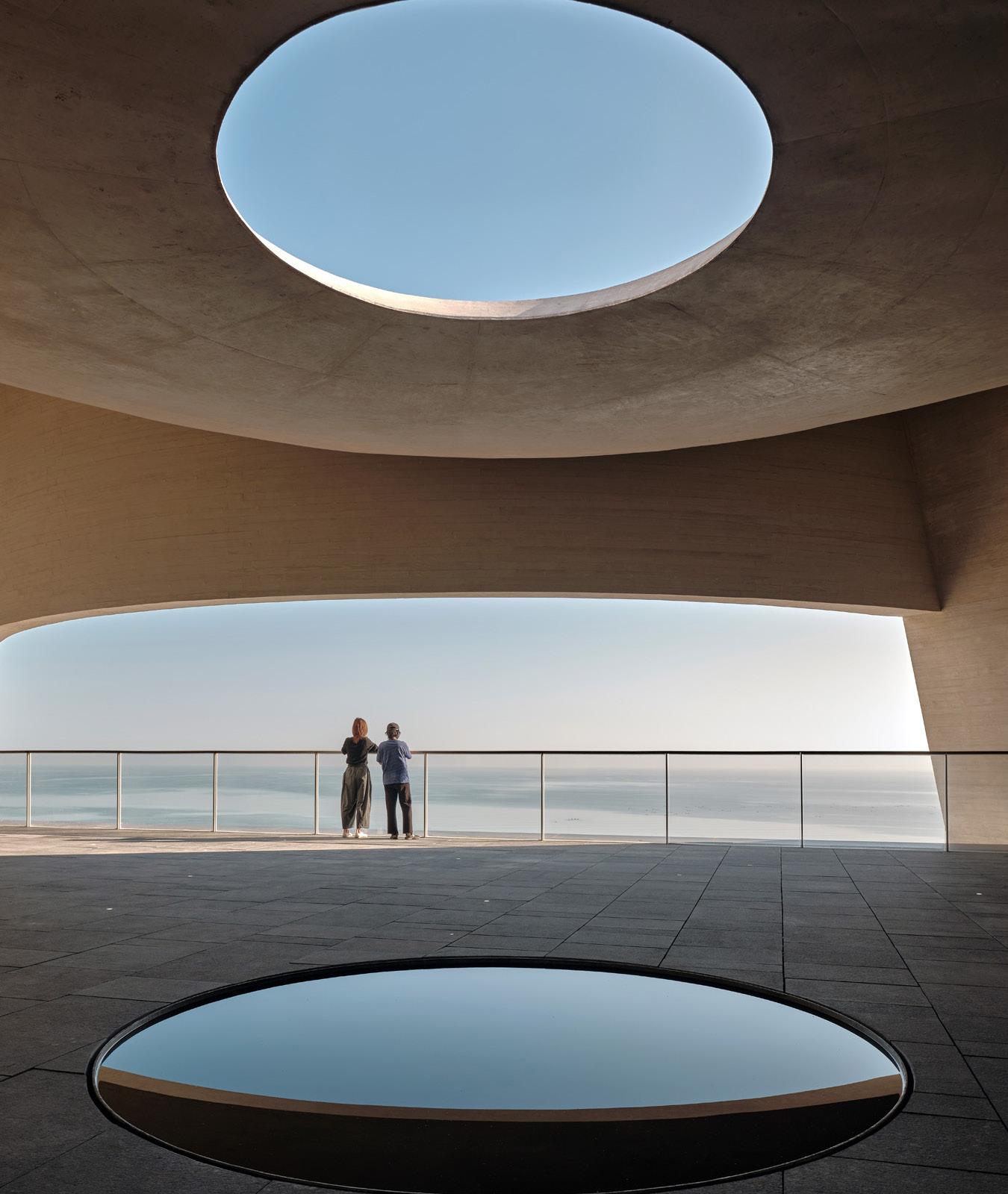 As visitors ascend the pedestrian ramps that wind through the structure, they come across exhibition spaces with digital screens and projection surfaces, and strategic hanging points for various displays. The top of the tower houses a library and the Phenomena Space, where visitors can appreciate the ocean views. This semi-outdoor observation deck features an oculus beneath which rainwater collects in a contemplative circular pool of water.