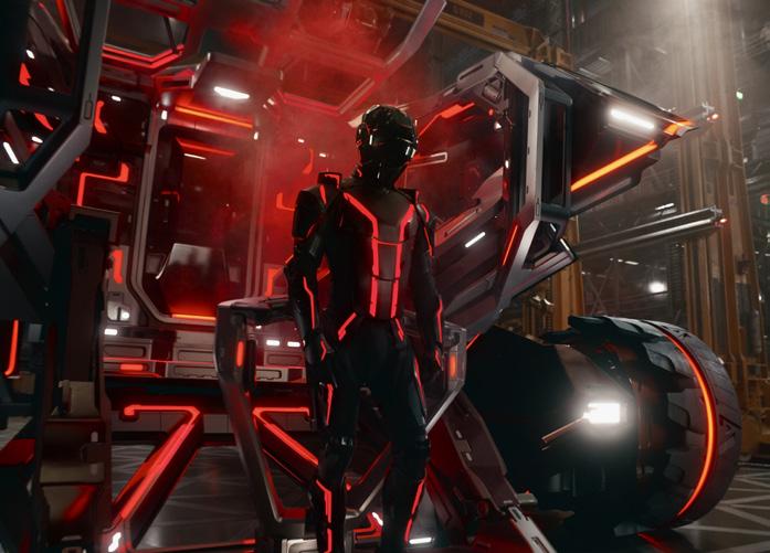 In contrast to Space Odyssey the original Tron film relied heavily on shadows and saturated light to define its digital setting. Lisberger uses darkness and contrast to his advantage, providing a greater sense of drama and realism while facilitating blending of real actors with the limited CGI capabilities of the 1980s. In the original film the actors’ iconic stripes of light embedded within their suits were manually coloured in after filming. In the 2010 film, costumes had integrated LED lighting allowing actors to better ‘inhabit’ their Tron characters.