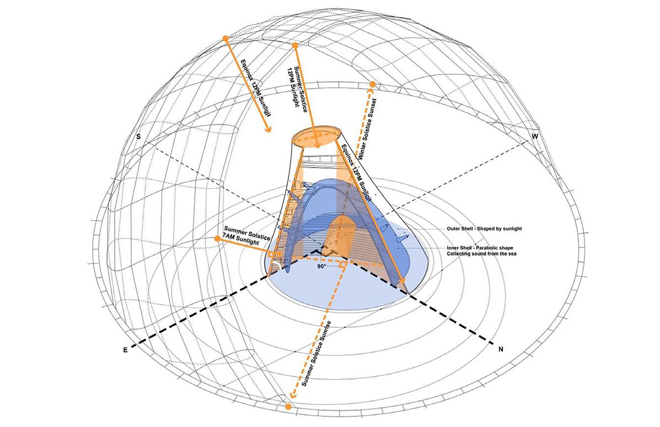 The outer, convex shell facing south and west was ‘shaped’ by the sun, while the inner, concave shell facing north and east is described as ‘collecting sound from the sea’. The edges of the tower and its various openings are determined by cardinal directions and solar markers, the equinoxes and solstices.