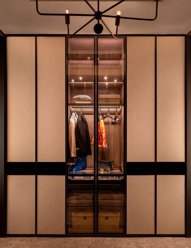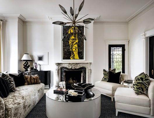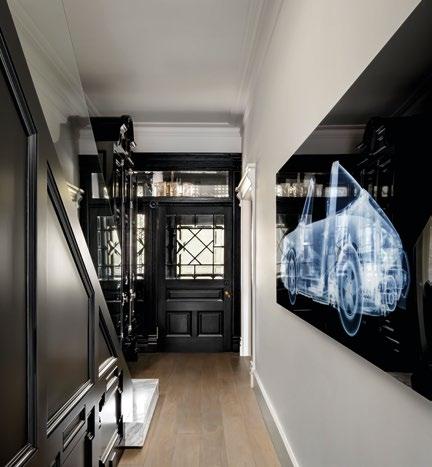 CLOCKWISE FROM TOP LEFT Light flows beautifully through the entryway; with its debonair finishes and bespoke furnishings, the house maintains a haute couture feel throughout; the architectural staircase, wrapped in dark upholstery, is complemented by a minimalist sleek black cabinet; the allwhite dressing room features jewellery-like embellishments; the secondary sitting room fuses glamorous detailing with soft edges and curved furniture profiles.