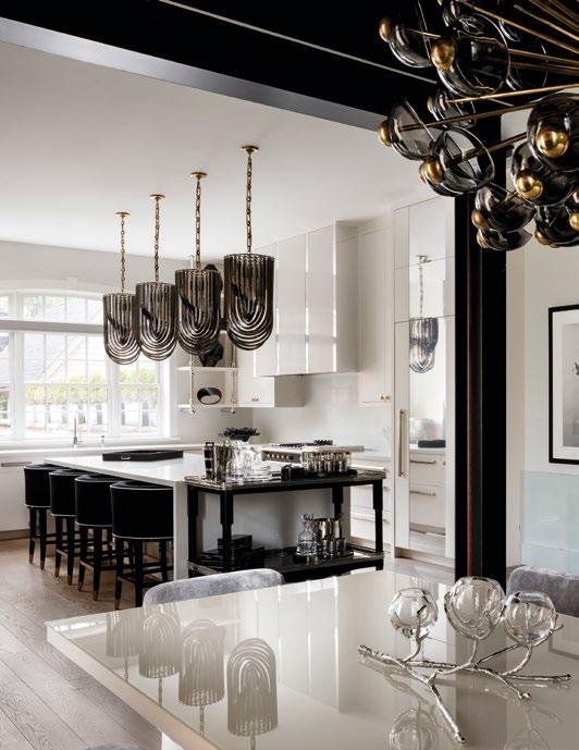 The kitchen offers a fresh, luminous contrast. Crisp white cabinetry and seamless countertops form a pristine backdrop for the spectacle of three smoked glass pendant lights, their tiered forms echoing Art Deco glam. The black and gold Lacanche range adds a note of vintage-inspired luxury, while a row of velvet upholstered counter stools with gleaming brass footrests brings warmth and texture to the space. This is a kitchen designed as much for visual impact as for function, with every surface and fixture speaking to refined taste.