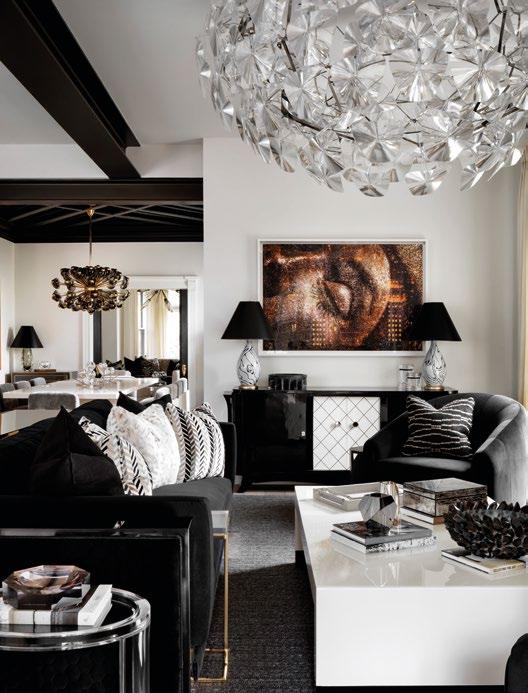 LEFT The main living room brings together velvet, high gloss, and patterned details to deliver a visually stimulating space.