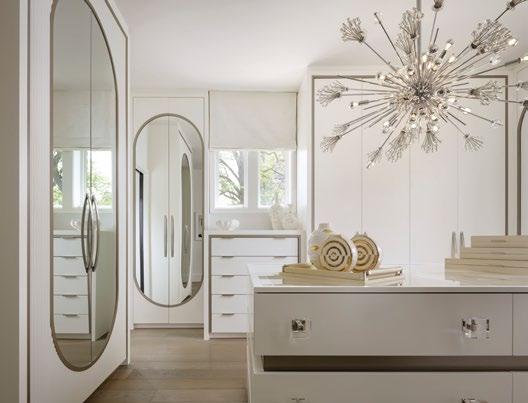In the dressing room, Lori Morris once again transforms function into fashion. High gloss cabinetry in pure white is accented by mirrored inlays with elegant curved frames. A central island with a polished stone top and jewellery-like hardware offers both display and storage. Overhead, a chrome starburst chandelier scatters light like diamond dust, turning daily rituals into moments of indulgence.