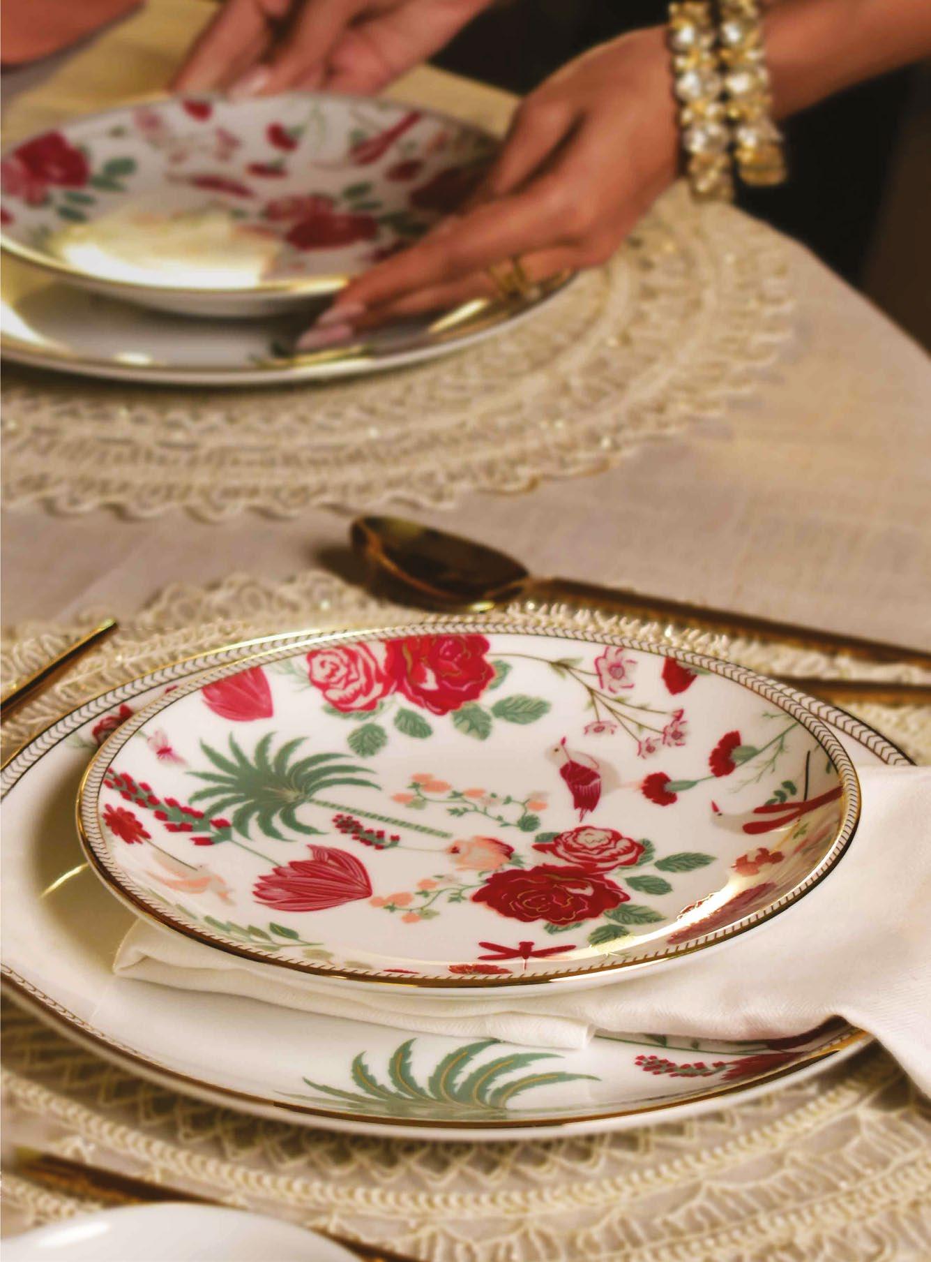 Their collection is a gallery of artistic conversation. From delicate Red Berry Plates with soft green leaves, to the ivory-white Wintertale Plates edged in gold; each piece feels like a poem in clay.