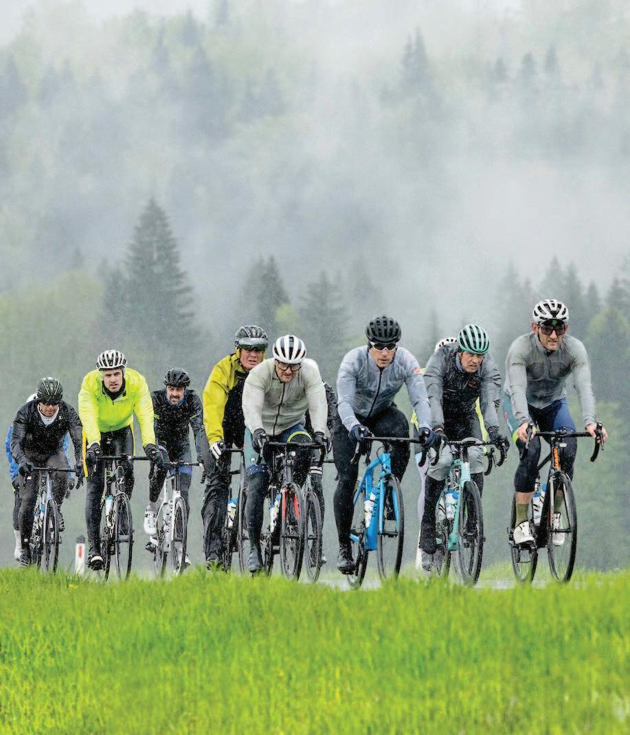 Fotograf Vid Ponikvar je v svoj objektiv ujel osmerico premočenih, premraženih in utr ujenih kolesarjev, ki se nekje v okolici Ribnice spopadajo s pr vo etapo humanitar ne kolesarske Dirke okrog Slovenije Sama se dobro spominjam, kako smo v tistih pr vih majskih dneh negodovali zaradi vremena, ki je bilo bolj podobno srednje hladnemu marcu kot maju … Nihče pri zdravi pameti 2. maja ni načr toval kolesarjenja.