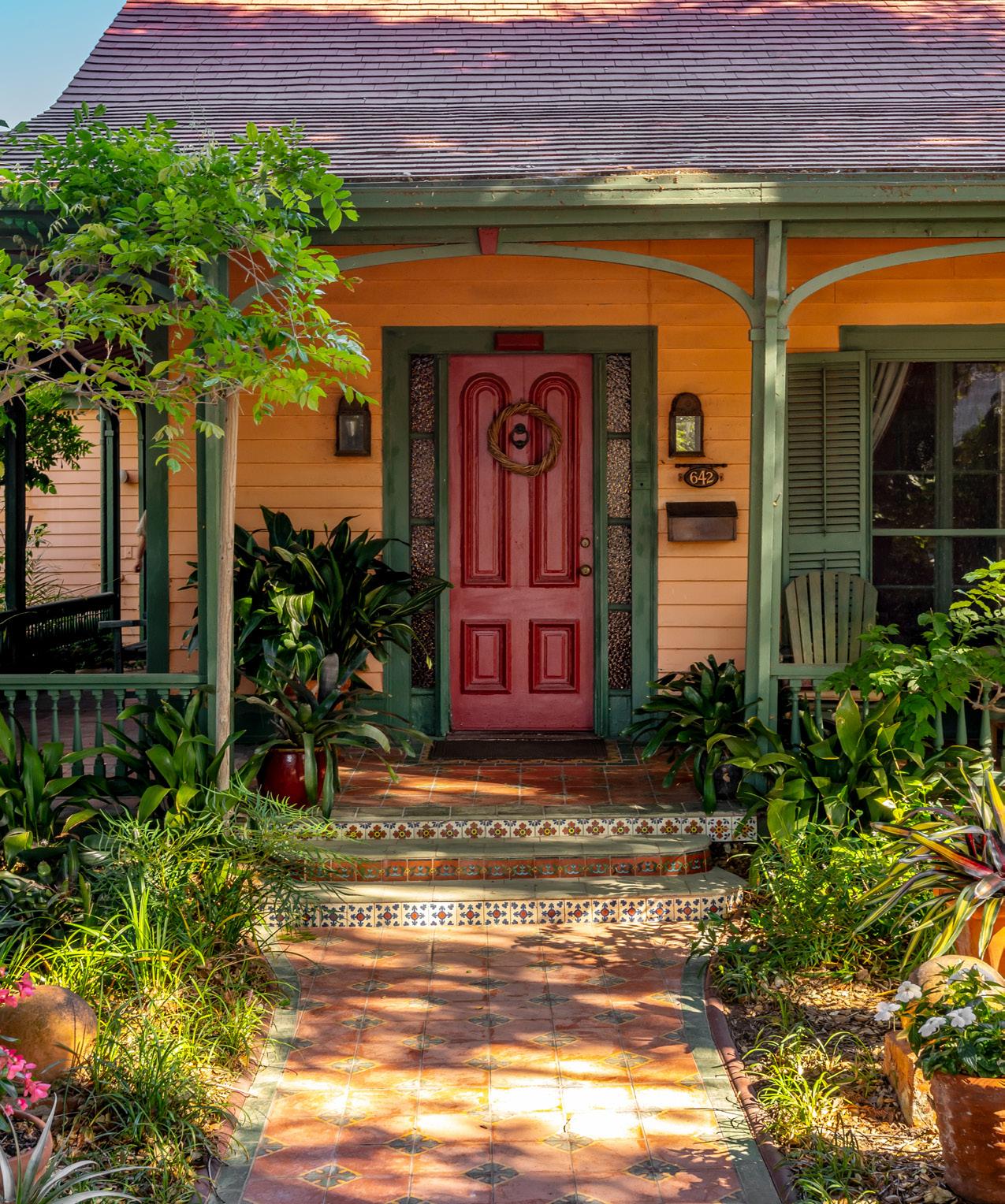 Perhaps the liveliest part of the house is the interior. The ten-foot-wide entrance hall welcomes visitors with vibrant hues of cantaloupe orange and green. The entire home is a symphony of color. Hannings’ travels have >>