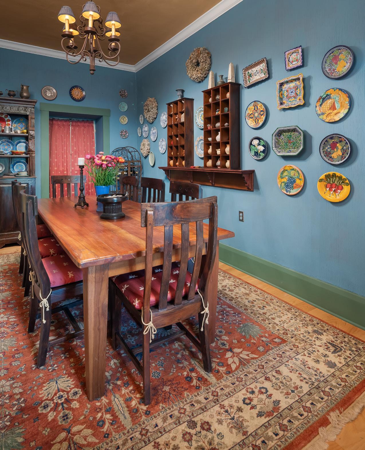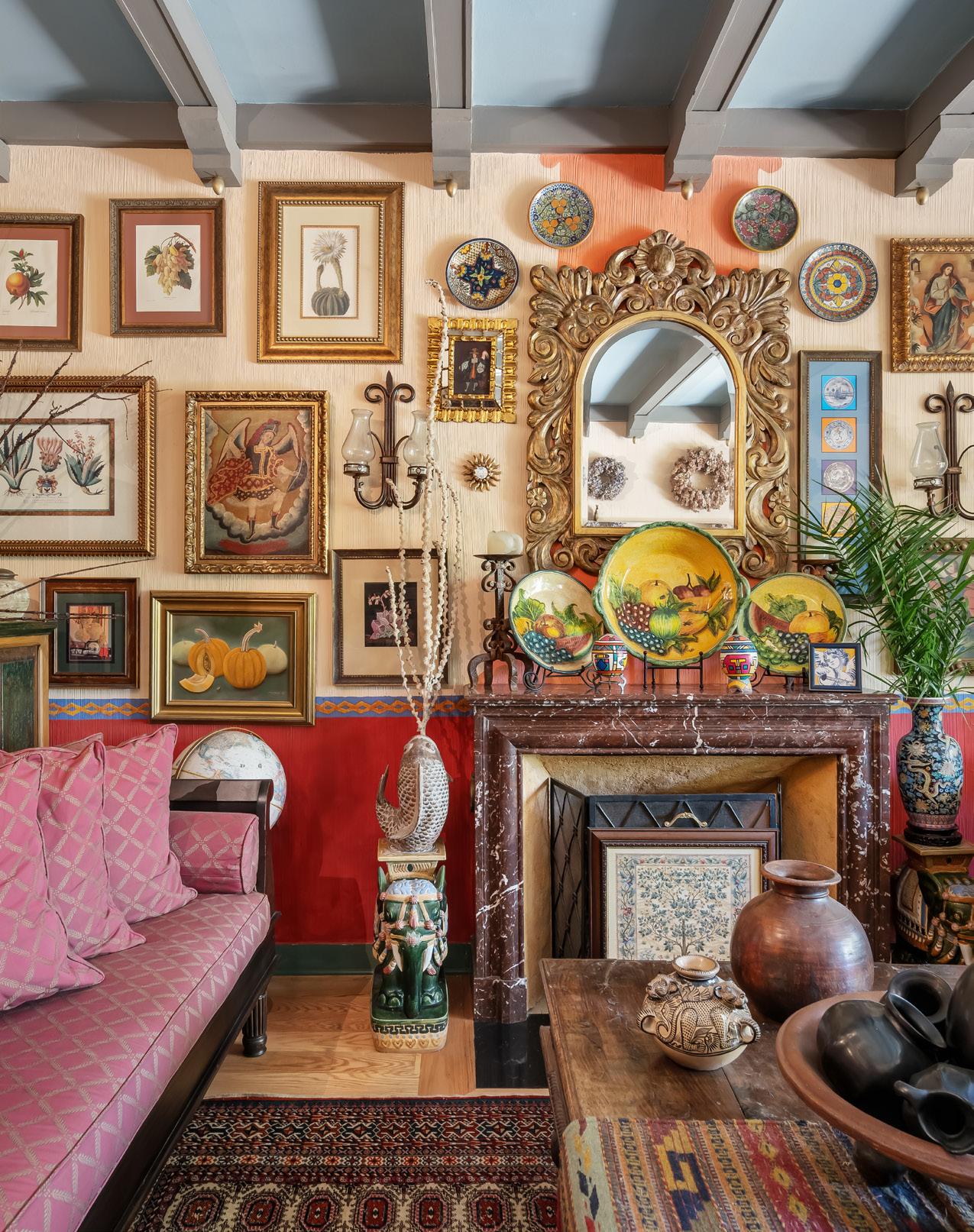 taken him around the world, and every piece in the home is a relic of those expeditions. Glazed Mexican and Italian pottery, West African and Mexican masks, insect specimens, and textiles from all around are collaged throughout the home. Hannings also hand-painted the wainscot detail in the living room, which was meticulously drawn on broom-finished plaster.