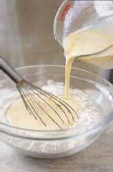 1. Mix the flour and sugar together in a bowl and make a well in the center. Beat the egg and the milk together and pour into the well.