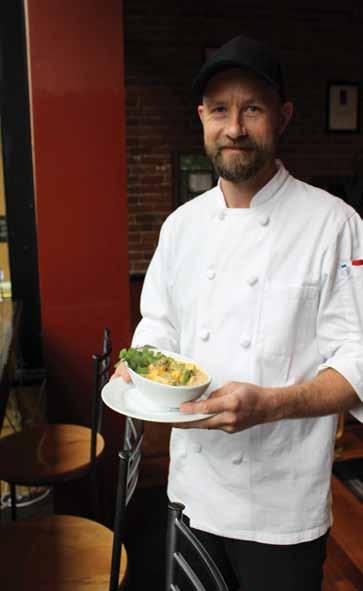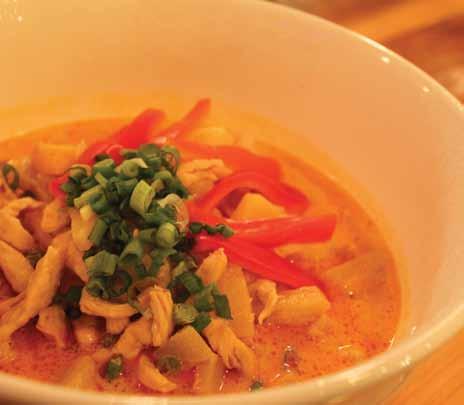 Ingredients in the paste include red chilies (responsible for the high heat factor), turmeric, onions, paprika and Laos powder, a term for dried galangal, an earthy relative of ginger. Partnered with coconut milk, pineapple, greens, shiitakes, and tofu (or beef, chicken or prawns), Novo’s red curry is a rich but balanced stew with plenty of upfront spice that mellows into three-dimensional flavor. “The focus here is on being authentic,” says Richardson, “not straying —even down to the garnishes.” >>