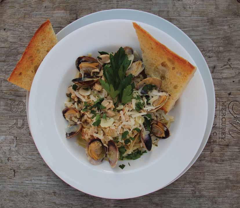 6. When pasta is al dente, add it to the sauté pan with the clams and sauce. Season with lemon, butter and Parmesan. Add tomatoes and parsley to garnish. Drizzle with olive oil. Serve with sliced sourdough bread. SLO LIFE