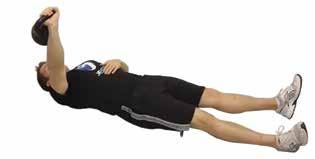 Lie on the ground with your legs straight. (No, yoga masters, it’s not time for savasana!) Grab a kettlebell by your side and, with the palm facing in, press the weight straight up while rotating the wrist (so the palms face the feet). Bring the kettlebell back down to the starting position, and repeat for 6 to 8 reps. SLO LIFE