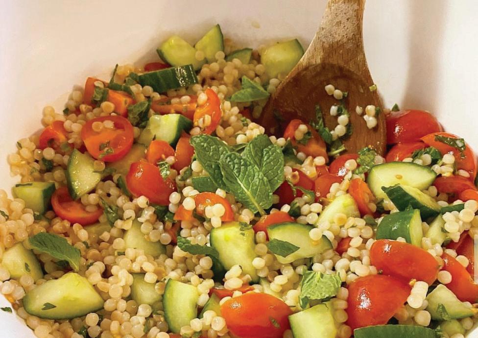 butter or olive oil before cooking. Toss with a drizzle of olive oil after it cooks so it won’t clump. Place in fridge for 30 min to cool. Meanwhile, wash and prep vegetables, mint, and lemons. Once cous cous is cool, pour into a large bowl with chopped veggies and mint. Toss in lemon zest, olive oil and juice from one lemon. Season with salt and pepper. Taste for desired tartness and add in more lemon juice if desired. Serve as a simple lunch with some fresh arugula or as a great side dish with your favorite barbecue!