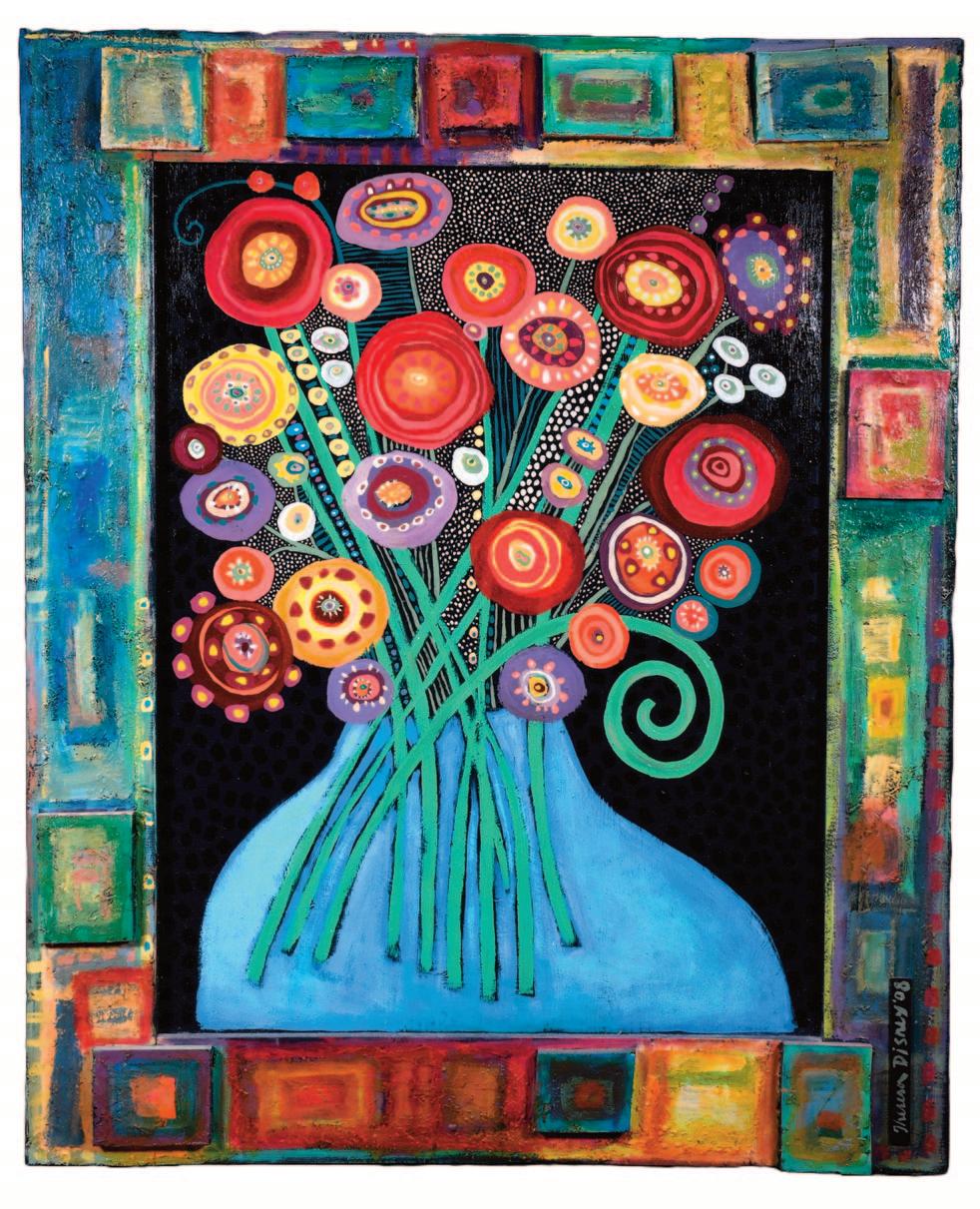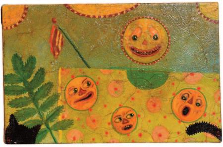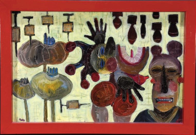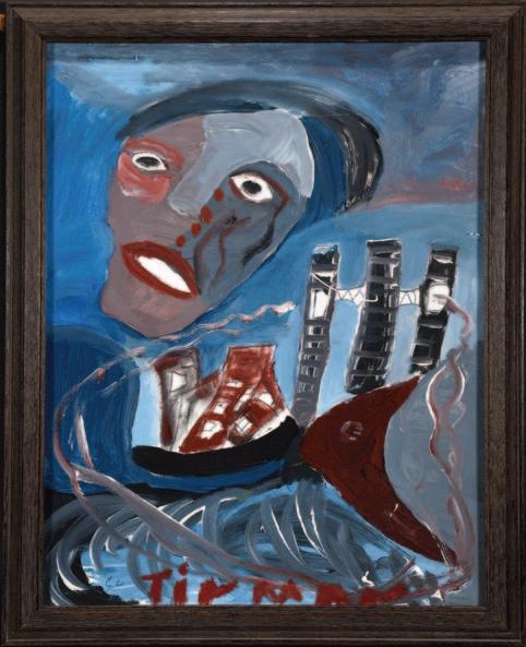 Paint on poster with artist-decorated frame. Excellent condition.