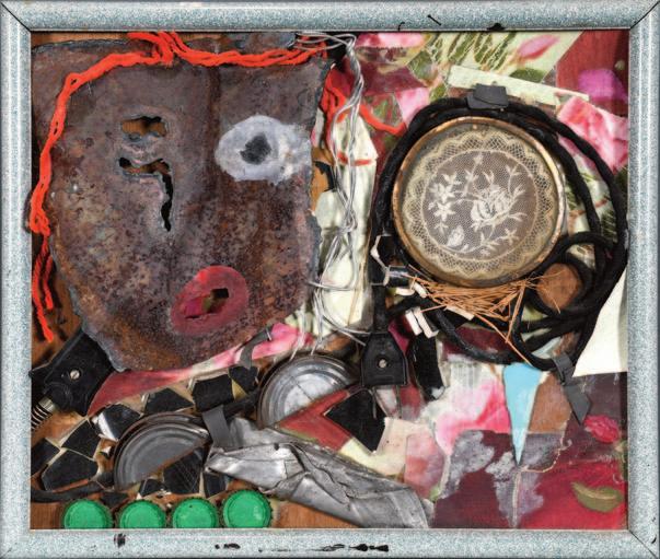 2001. Signed, titled and dated on verso. Mixed media and metal on board. Great found condition.