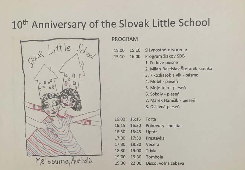 Vďaka všetkým za fantastický večer oslavy 10.výročia založenia Slovenskej detskej besedy a tiež oslavy Dňa zahraničných Slovákov. Menovite deťom, rodičom, učiteľkám, vzácnym hosťom, krajanskej komunite. V programe sme videli : Zmes slovenských ľudových pesničiek, divadielko o 7 kozliatkach, pásmo starších žiakov o živote Generála Milana Rastislava Štefanika, rap pesničku o futbalistovi Hamšíkovi, ktorú podľa pesničky českého speváka Krištofa napísal a spolu s kamarátmi zaspieval Erik Bučko, našu školskú hymnu Hej sokoly a po oslavnej piesni zatancoval a zaspieval aj pár folklórneho súboru Liptár - Ben Peška s partnerkou. Všetkým veľká vďaka, vzácnym hosťom - honorárnej konzulke Českej republiky, Lenke Allen, riaditeľke Poľskej školy v Albione Grazyne Walenczik s učiteľkami, Ľubici Shannon, riaditeľke Českého a slovenského festivalu v Austrálii, vďaka za účasť. Ďakujeme pozdravom JE Tomášovi Ferkovi veľvyslancovi SR v Austrálii aj za stálu podporu slovenských vzdelávacích centier v Austrálii, Zuzane Vasitch, riaditeľke Českej školy v Melbourne, Ivetke Havrilovej, jednej zo zakladateliek našej školy. Nesmieme zabudnúť na výbor Australian Slovaks Association in Victoria pod vedením jeho predsedu, Ivana Kovarčíka a Norike Kovarčíkovej za Slovenskú detskú besedu za prípravu a organizáciu celého podujatia.