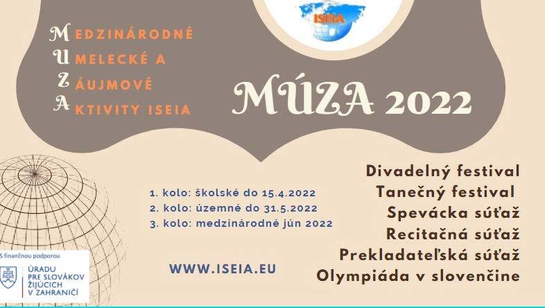 MÚZA 2022 - Olympiáda v slovenksom jazyku ISEIA spustila nový súťažný projekt s názvom MÚZA 2022 - Medzinárodné Umelecké a Záujmové Aktivity ISEIA. Pod jej hlavičkou prebieha v týchto dňoch pilotný ročník Olympiády v slovenskom jazyku. Do súťaže sa zapojili deti vo veku 8-12 rokov z rôznych krajín. Zosúladiť vzdelávacie centrá po celom svete a zostaviť úlohy, aby pokryli rôzne jazykové úrovne detí, bola, je a bude skutočná výzva. Nesmierne nám pomáha spätná väzba súťažiacich, ako aj ich učiteľov a učiteliek. Všetky zozbierané skúsenosti nám pomôžu pripraviť sa lepšie na budúce ročníky. Množstvo pozitívnych feedbackov nás utvrdzuje v správnom kroku, vytvoriť takúto súťaž. I
