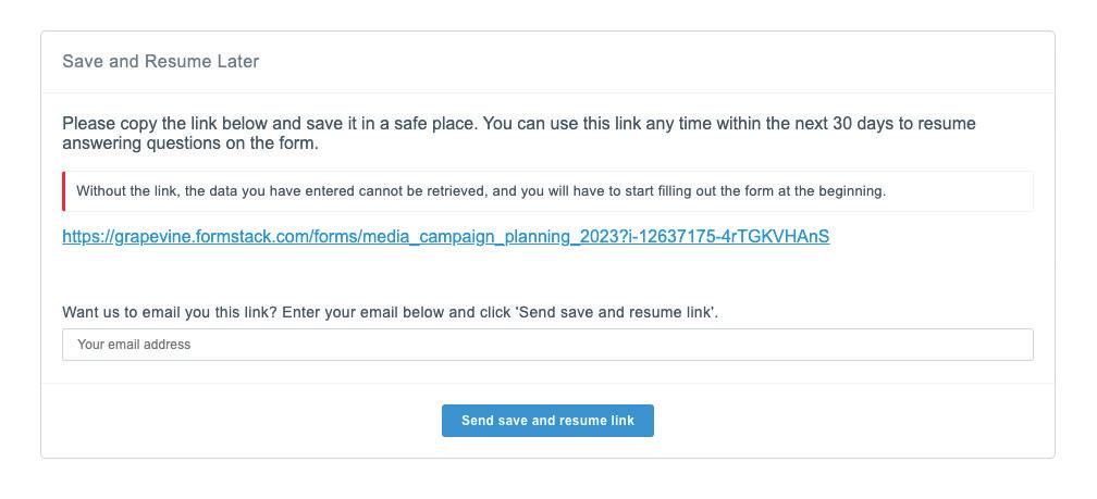 We recommend filling out the email box with your email address – Brandworks will automatically email you the link for safekeeping. Your link will be good to resume for up to 30 days.
