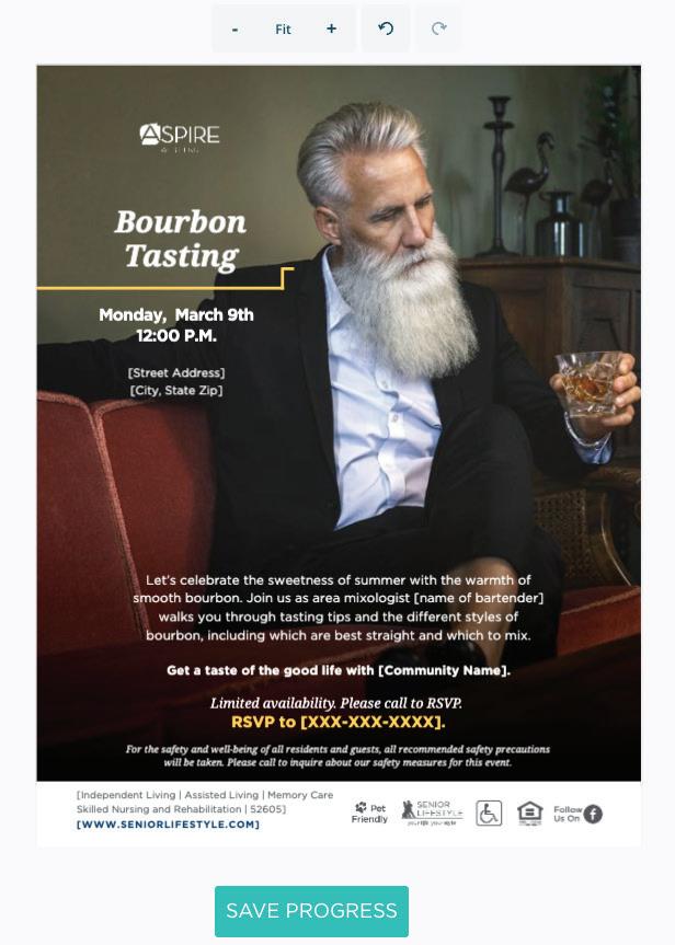 As you continue to customize the piece, you’ll want to save your progress. It’s also critical that you customize the bottom section of the flyer, removing the levels of care that your community doesn’t have, adding your license number if applicable and adjusting the seniorlifestyle.com if your community has a custom URL. If it does not, simply remove the surrounding brackets.