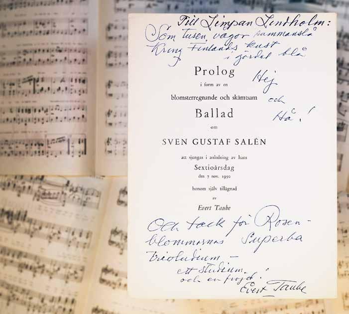 Evert Taubes hälsning till Limpan Lindholm är nedtecknad på ett titelblad. Jubilaren Sven Salén var en av grundarna till Samfundet Visans Vänner i Stockholm. Foto: Kai Martonen
