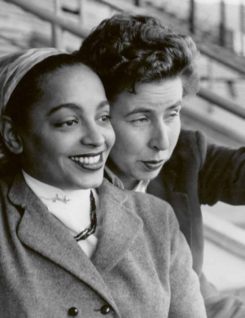 Vivica Bandler (t.h.) tillsammans med den franska sångerskan Moune de Rivel på Olympiastadion i Helsingfors 1952. Foto: SLS/Vivica Bandlers arkiv