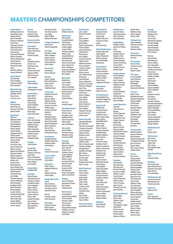MASTERS CHAMPIONSHIPS COMPETITORS Avalon Beach Melinda Akehurst Ross Bidencope Ashley Brown Alan Channells Shannon Fletcher Ruth Frost Amanda Lehman Sally Macintosh Chris McGuckin Kate Munro Leonardo Pinheiro Patrick Quinlan Robert Richardson Grant Salmon David Spencer Stephanie Stoddard Beverley Tilbury Donna Wishart Avoca Beach Paul Kendal Stan Priestley Graham Settree Steve Sharpe Batemans Bay Megan Douros Danielle Heron Tracy Innes Erna Van Luin Bilgola Grant Jacobs Mark Parsons Norman Pounder Garett Smith Bondi Surf Bathers Malcolm Allen Cyril Baldock Grant Baldock Michael Barry Olivier Brisse Calvin Brodie Gregory Byrnes Craig Carney Robert Chapman Angus Chard Neil Collins Courtney Date Gary Emmerton Robyn Farmer Josep Font Sadurni Rozanne Green Steven Hackers William Hardman Robyn Hill Bruce Innes Brent Jackson Anne-Marie Kruk Felicity MacArthur Matt Malcolm Kristy McIntyre Dori Miller Thomas Nguyen Simon Nothling Alex Porebski Jonathan Potts Julie Pritchard James Rogers Louise Santos Damon Somerfield Laura Thurtell Abril Vitte Soto Edwin Wildie Samantha Wolf Laurie Young